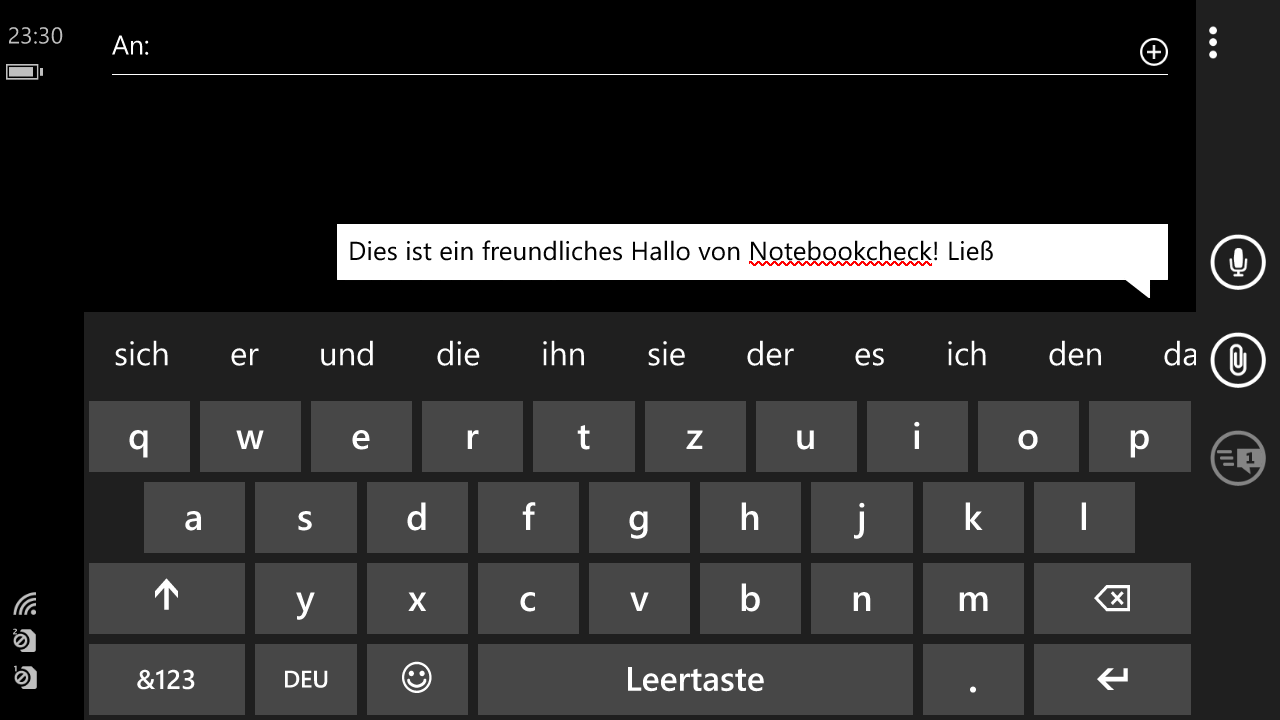 Das Tastaturlayout entspricht dem Standard von Windows Phone 8.1 und kann nicht angepasst werden. Wischeingaben werden unterstützt und in einer Zeile über der virtuellen Tastatur werden passende Wortvorschläge gemacht.