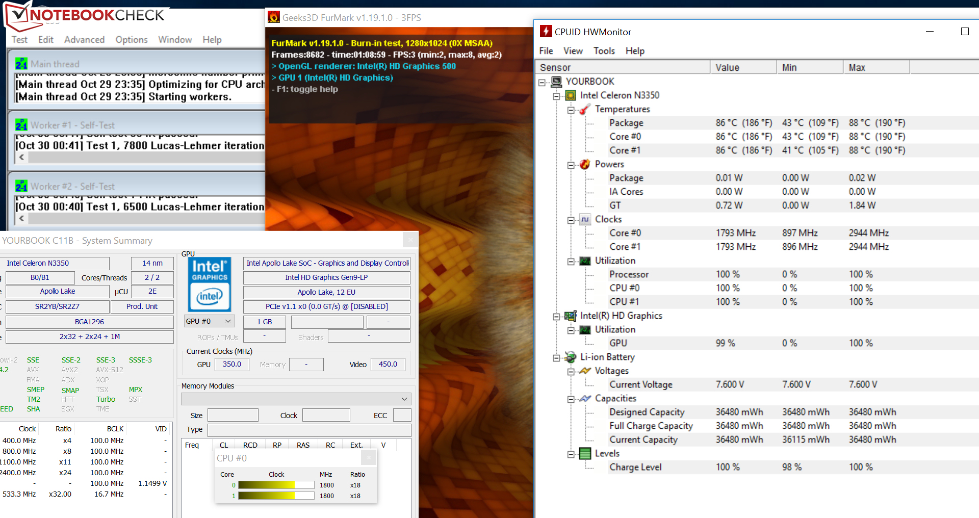 Das Yourbook wird von einem Intel Celeron N3350 (Apollo Lake) Zweikernprozessor befeuert. Die geringe TDP erlaubt eine passive Kühlung der CPU. Der N3350 arbeitet mit einer Basisgeschwindigkeit von 1,1 GHz. Mittels Turbo ist eine Steigerung auf bis zu 2,3 GHz (beide Kerne) bzw. 2,4 GHz (nur ein Kern) möglich. Die von uns durchgeführten CPU-Tests bearbeitet der Prozessor stets mit 2,2 bis 2,3 GHz. Das gilt sowohl für den Netz- als auch für den Akkubetrieb.