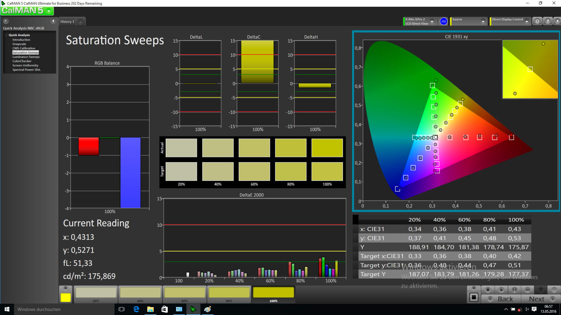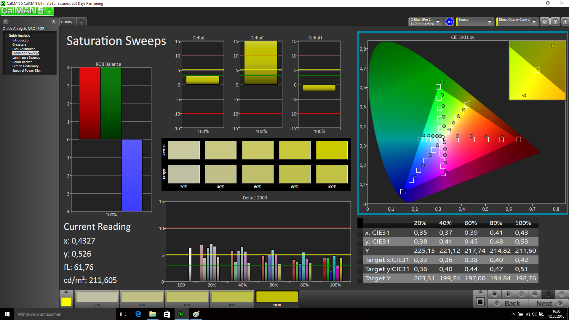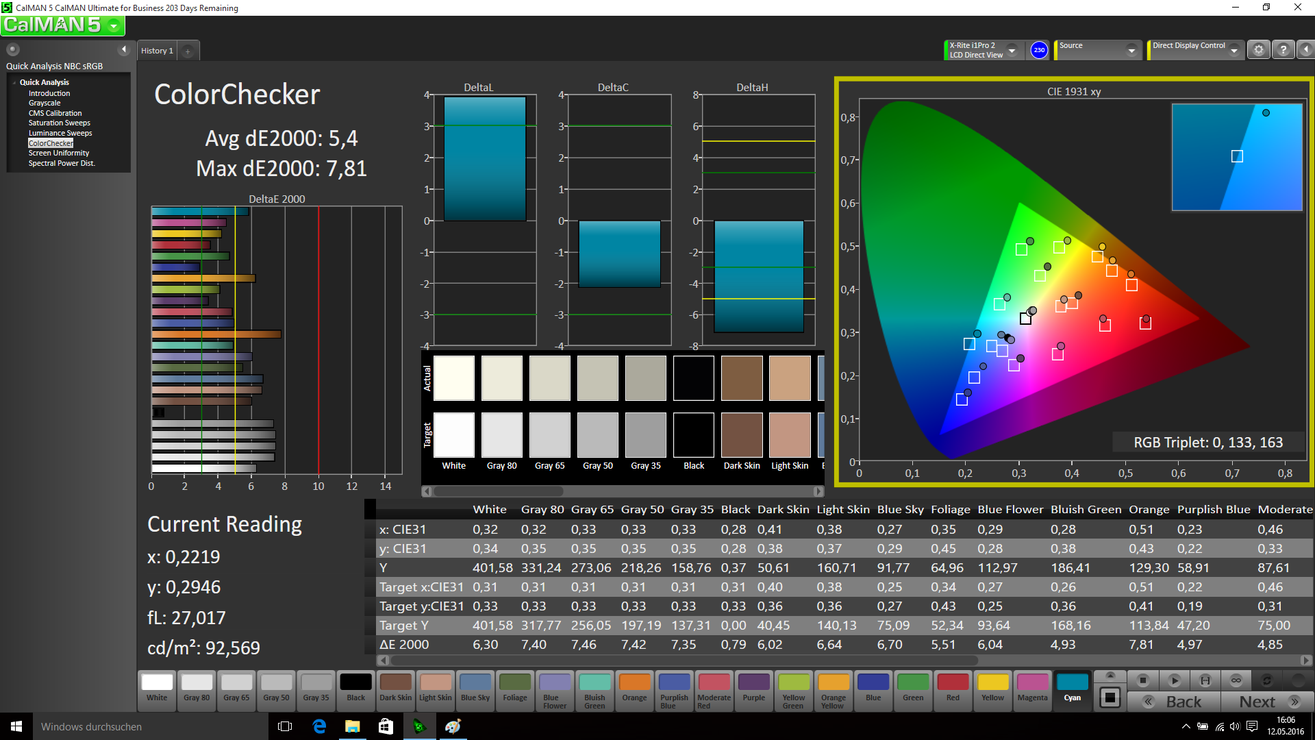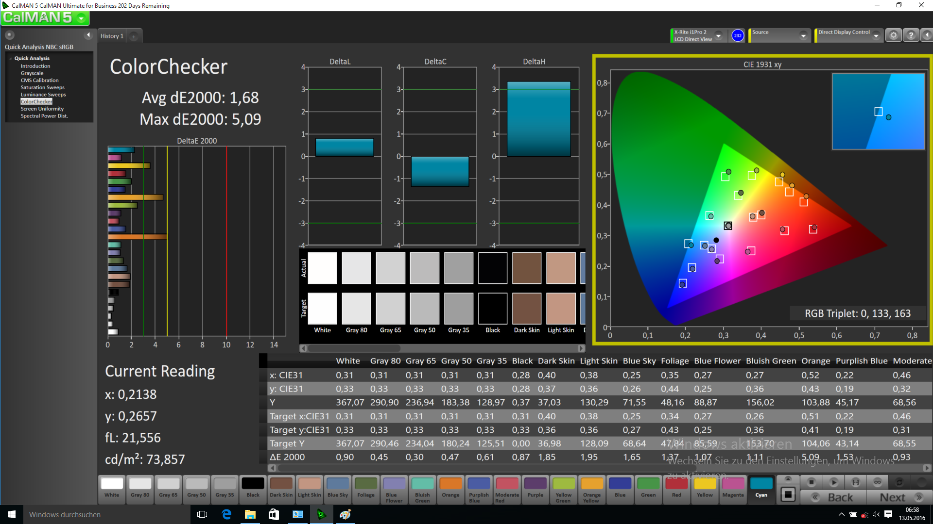 Die DeltaE-2000-Farbabweichung des Bildschirms liegt im Auslieferungszustand bei einem Wert von 5,4. Der Zielbereich (DeltaE kleiner 3) liegt nicht allzu weit entfernt. Unter einem Blaustich leidet das Display nicht. Mittels einer Kalibrierung des Bildschirms kann die Farbdarstellung verbessert werden. Die Farbabweichung sinkt auf einen Wert von 1,68, und die Graustufen werden ausgewogener dargestellt.