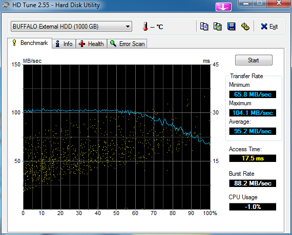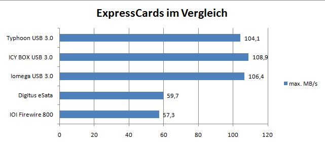 Auch leistungsmäßig unterscheidet sich Typhoons ExpressCard kaum von den bisher getesteten Modellen der Marken Raidsonic und Iomega. Mit Transferraten von bis zu 104,1 MB/s (NEC-Chip) sind die Abweichungen nur minimal und für eine anstehende Kaufentscheidung vernachlässigbar. Die Handhabung ist identisch und überzeugt mit einer einfachen und schnellen Inbetriebnahme nach der Treiberinstallation. Festplatten mit eigener Stromversorgung werden direkt und ohne Probleme erkannt. Die alleinige Stromversorgung über USB 3.0 gelang mit verschiedenen externen 2,5“ Festplatten jedoch nicht immer zuverlässig und man musste auf die zusätzliche USB 2.0-Versorgung zurückgreifen. Dazu gehörte Verbatims Store`n`Go portable USB 3.0 (nur USB 3.0 Anschluss, Fujitsu MJA2500BH G2 mit 5400 U/min) genauso, wie Typhoons externes USB 3.0 Festplattengehäuse mit einer Toshiba MK3256GSY (7200 U/min) bestückt, die nur mit zusätzlicher USB 2.0-Versorgung arbeiteten.