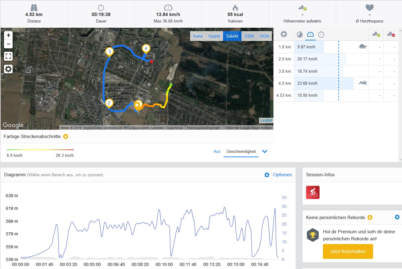 Im Praxistest, einer Radtour mit dem Umidigi A1 Pro und dem Profi-Navi Garmin Edge 520 als Vergleichsgerät schneidet das China-Handy gar nicht so schlecht ab: Die Strecke wird meist ordentlich nachvollzogen, ab und an schweift das Umidigi A1 Pro ab, aber immerhin kann man meist die Straßenseite erkennen, auf der gefahren wurde.