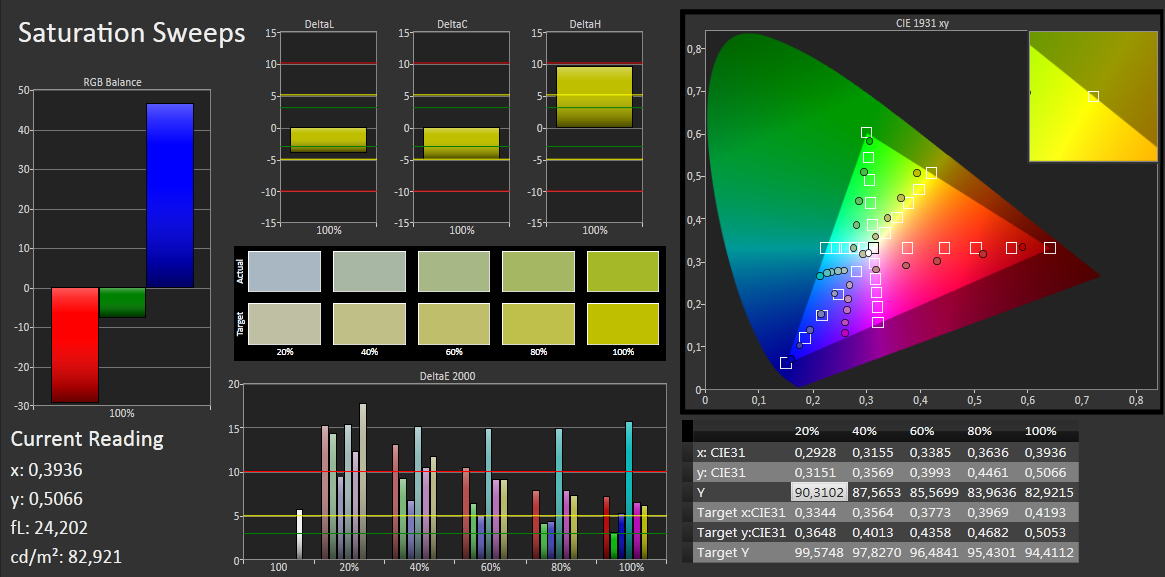 | sRGB Coverage (%) | 81.9 | 80.6 -2% | 81.6 0% | 61.1 -25% | 63.4 -23% |