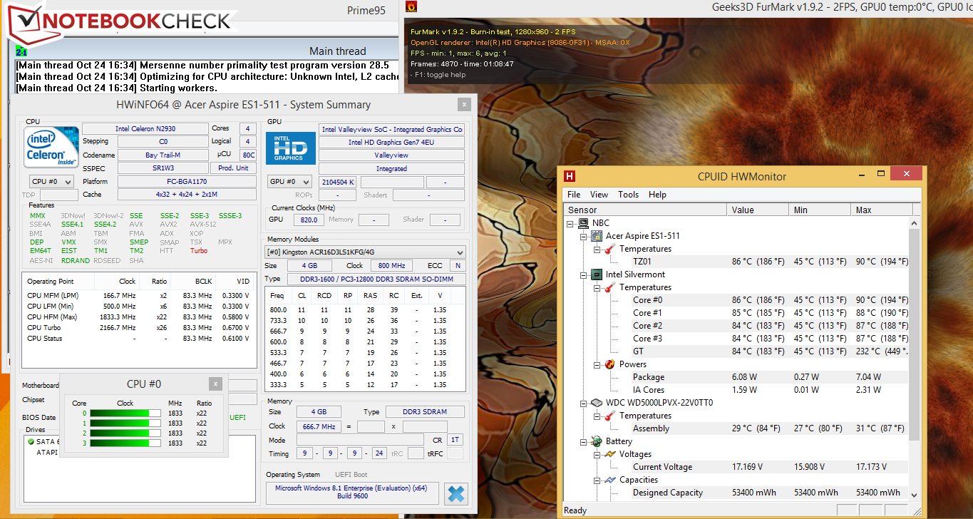 Das Aspire zeigt während unseres Stresstests (Prime95 und Furmark laufen für mindestens eine Stunde) im Netz- und im Akkubetrieb das gleiche Verhalten: Der Prozessor startet den Test mit voller Geschwindigkeit (2,16 GHz). Nach etwa 20 bis 30 Minuten wird die Geschwindigkeit auf 1,83 GHz gedrosselt und verharrt auf diesem Wert. Der Grafikkern werkelt mit 820 MHz. Eine starke Hitzeentwicklung ist weder beim Aspire noch beim baugleichen Packard Bell Easynote TF71BM-C8R1 festzustellen. Während des Stresstests liegen die Gehäusetemperaturen an jedem Messpunkt unterhalb von 40 Grad Celsius.