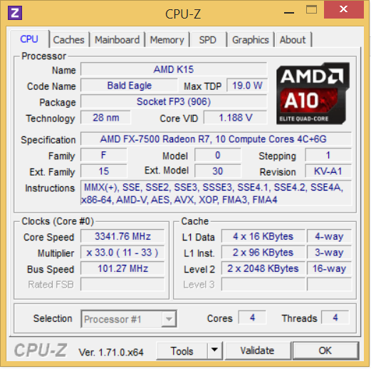 Das Aspire wird von einer AMD FX-7500 APU (Kaveri) befeuert. Der CPU-Teil der APU besteht aus vier Prozessorkernen, die mit einer Basisgeschwindigkeit von 2,1 GHz arbeiten. Mittels Turbo kann die Geschwindigkeit auf bis zu 3,3 GHz erhöht werden. Die TDP der APU liegt mit 19 Watt etwas oberhalb derjenigen von Intels Haswell-ULV-Prozessoren (15 Watt). Wie schon der Prozessor des kürzlich getesteten Thinkpad E555, kann auch die CPU des Aspire ihre volle Rechenleistung nicht entfalten. Die Single-Thread-Tests der Cinebench Benchmarks werden mit 2,5 bis 2,8 GHz durchlaufen. Die Multi-Thread-Tests werden mit 1,9 bis 2,5 GHz bearbeitet. Werden die Tests im Akkubetrieb durchgeführt, arbeitet der Prozessor mit konstanten 2,1 GHz. Alles in allem liegt der Prozessor leistungsmäßig auf einer Höhe mit Intels Core i3-4010U Prozessor. Würde die AMD-CPU ihren Turbo voll ausfahren, könnte sie den Intel-Prozessor überflügeln - bei Multi-Thread-Anwendungen mehr als deutlich.
