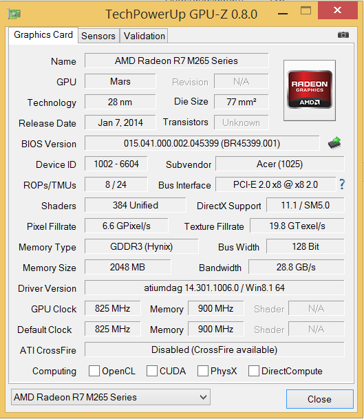 Das Aspire ist mit zwei Grafikkernen ausgestattet. Da wäre zum einen der integrierte Radeon R7 (Kaveri) Chip und zum anderen die dedizierte Radeon R7 M265 GPU. Es ist für den Nutzer nicht auf den ersten Blick ersichtlich, ob die beiden Kerne in einem Crossfire-Verbund (Dualgraphics) oder einem Enduro-Verbund (Grafikumschaltung) arbeiten. Acer konnte uns hier auch keine eindeutige Antwort geben. Ein Blick ins Konfigurationsmenü und die Resultate in unseren diversen Benchmarks, lassen vermuten, dass es sich um einen Enduro-Verbund handelt. Die integrierte GPU kommt in Alltags- und Akkubetrieb zum Einsatz. Der dedizierte Kern ist immer dann gefragt, wenn viel Grafikleistung benötigt wird - beispielsweise bei Spielen. Beide GPUs unterstützen DirectX 11.2. Der Radeon R7 M265 Grafikkern ist der GPU-Mittelklasse zuzuordnen. Er arbeitet mit Geschwindigkeiten bis zu 825 MHz. Die Resultate in den 3D Mark Benchmarks liegen in etwa auf einer Höhe mit denen anderer Notebooks, die mit dem Radeon R7 M265 Chip bestückt sind - beispielsweise das Aspire V5-561G und das Aspire E1-572G. Der sehr leichte Rückstand des Aspire ist auf die etwas schwächere CPU zurückzuführen.