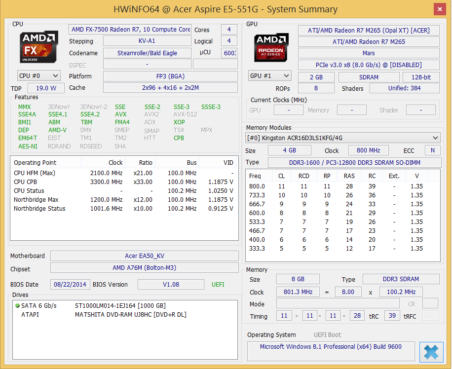 | Acer Aspire E5-551G-F1EW Radeon R7 M265, FX-7500, Seagate ST1000LM014 Solid State Hybrid Drive | HP Pavilion 15-p008ng GeForce 840M, 4210U, HGST Travelstar 5K1000 HTS541075A9E680 | Dell Inspiron 15 3542-2293 GeForce 820M, 4210U, Seagate Momentus Thin ST500LT012-1DG142 | Acer Aspire V5-561G Radeon R7 M265, 4200U, WDC Scorpio Blue WD10JPVX-22JC3T0 | Acer Aspire E5-551-T8X3 Radeon R6 (Kaveri), A10-7300, Western Digital Scorpio Blue WD5000LPVX | |
