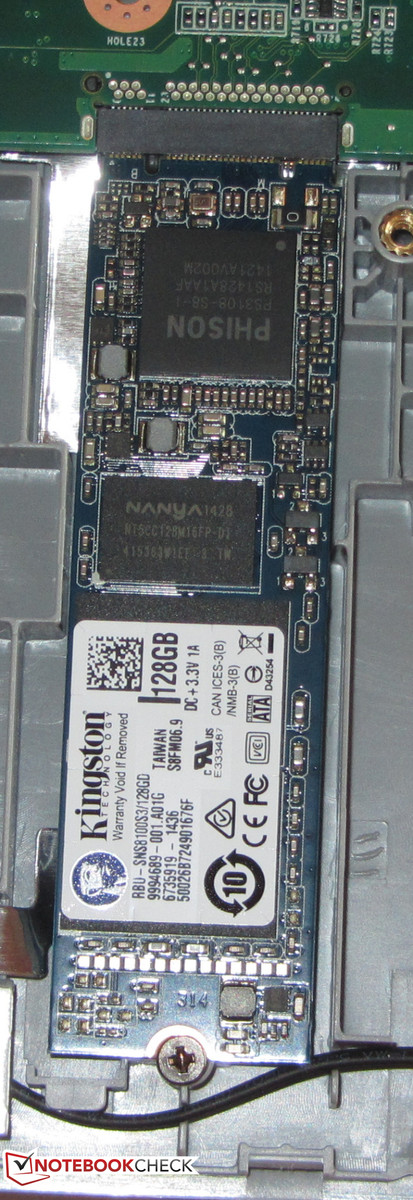 Als Systemlaufwerk dient eine Solid State Disk aus dem Hause Kingston. Es handelt sich hierbei um ein Modell im M.2-Format. Die SSD bietet eine Kapazität von 128 GB. Dem Besitzer stehen davon etwa 90 GB zur freien Verfügung. Die Leseraten der SSD fallen insgesamt gut aus. Die Schreibraten bleiben deutlich hinter den Möglichkeiten heutiger SSDs zurück. Es sind schnellere Modelle verfügbar. Neben der SSD steckt auch eine herkömmliche 2,5-Zoll-Festplatte in dem Notebook. Diese besitzt eine Kapazität von 1 TB und arbeitet mit einer Geschwindigkeit von 5.400 Umdrehungen pro Minute.