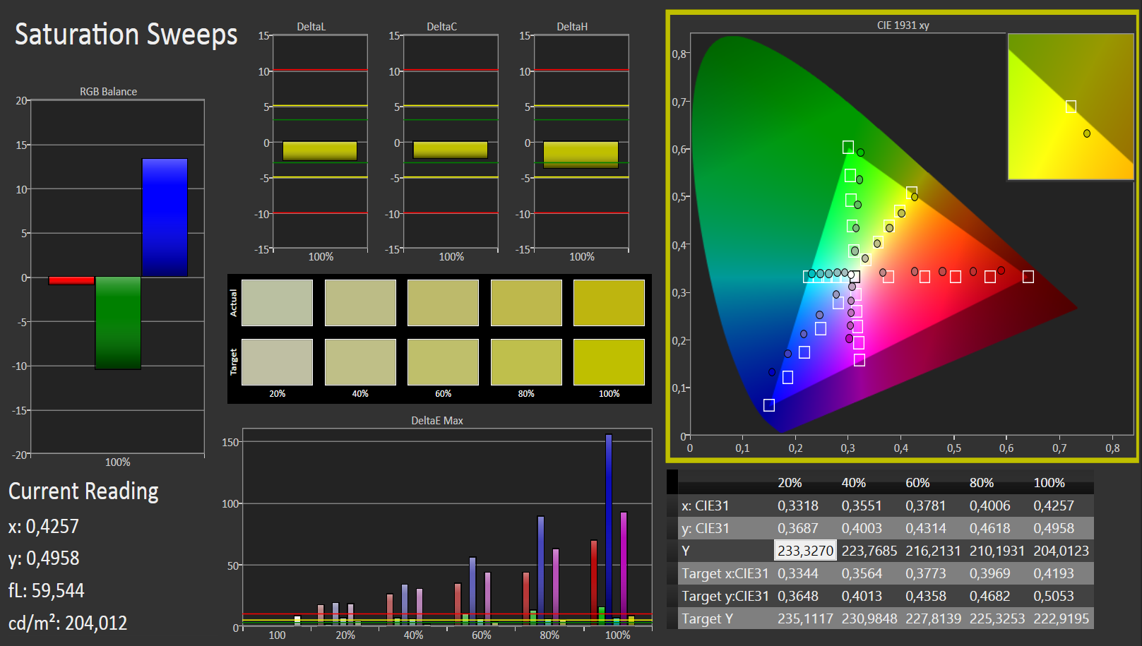 Wir haben den Auslieferungszustand des Panels mit dem CalMAN Tool und einem Fotospektrometer vermessen und erkennen ein niedriges Graustufen DeltaE von knapp 5. Das ist nicht perfekt, aber schon recht gut. Ein Wert von unter drei ist der Zielzustand, welcher bedeutet: Das ungeschulte menschliche Auge kann keinen Unterschied mehr zwischen sRGB-Referenzkarte und angezeigter Farbe ausmachen.