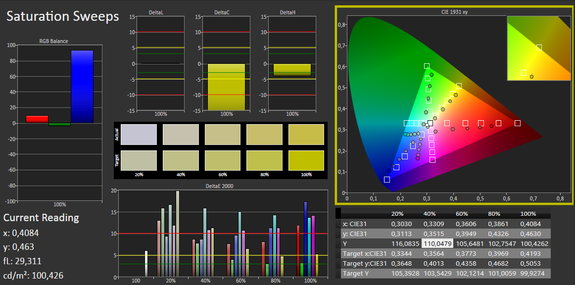 Im Auslieferungszustand liegt die durchschnittliche DeltaE-2000-Abweichung des Bildschirms bei einem Wert von 8,83. Damit schneidet das Display etwas besser ab als die meisten von uns vermessenen Bildschirme (DeltaE von 10 bis 12). Den Zielbereich (DeltaE kleiner 3) erreicht das Aspire Display aber nicht einmal annähernd. Zudem weist der Bildschirm einen deutlichen Blaustich auf.