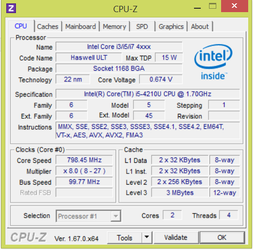 Im Inneren des Aspire steckt ein Core i5-4210U Prozessor. Dieser Haswell Zweikerner arbeitet mit einer Basisgeschwindigkeit von 1,7 GHz. Per Turbo kann die Geschwindigkeit auf 2,4 GHz (zwei Kerne) bzw. 2,7 GHz (nur ein Kern) gesteigert werden. Die CPU besitzt eine TDP von 15 Watt. Die volle Rechenleistung der CPU steht im Netzbetrieb nicht ganz zur Verfügung. Die Single-Thread-Tests der Cinebench Benchmarks durchläuft der Prozessor mit 2,4 GHz, die Multi-Thread-Tests werden mit 2,2 bis 2,3 GHz bearbeitet. Im Akkubetrieb bestreitet die CPU beide Tests mit 1,7 GHz. Der Turbo wird dann nicht genutzt. Entsprechend geringer fallen auch die Resultate aus (Cinebench R11.5: Single - 0,76; Multi - 1,82).