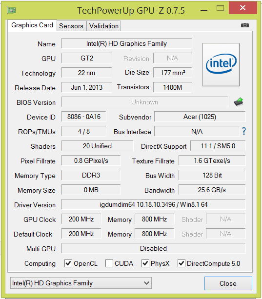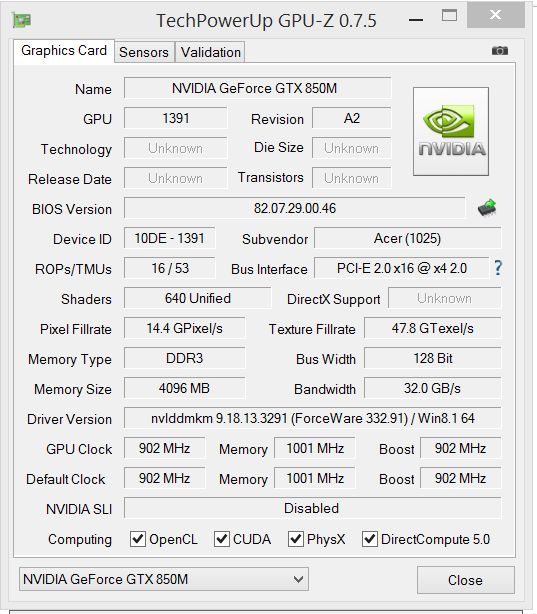 Ein Optimus Verbund bestehend aus Intels HD Graphics 4400 GPU und dem GeForce GTX 850M Grafikkern ist für die Grafikausgabe zuständig. Der Alltags- und Akkubetrieb wird dabei vom Intel Chip bestritten; während der GeForce Chip für leistungsfordernde Anwendungen wie Computerspiele herangezogen wird. Beide Kerne unterstützen mindestens DirectX 11. Der GeForce Kern gehört der oberen GPU-Mittelklasse an. Er arbeitet mit einer Basisgeschwindigkeit von 876 MHz. Per Turbo kann die Geschwindigkeit auf 1.084 MHz erhöht werden. Die Ergebnisse in den 3D Mark Benchmarks liegen im erwarteten Bereich. Die bisher von uns getesteten Notebooks mit GeForce-GTX-850M-Kern-liefern insgesamt etwas bessere Resultate, da sie durchgehend mit starken Mobilprozessoren (Zwei- bzw. Vierkerner; kein ULV) bestückt sind. Sein mit dem GeForce GT 750M Grafikkern ausgestattetes Schwestermodell kann das Aspire mehr als deutlich schlagen.