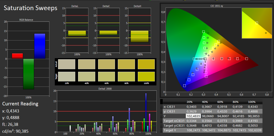 Zudem hat das Display eine überraschend gute Farbdarstellung zu bieten. Schon im Auslieferungszustand zeigt der Bildschirm eine DeltaE-2000-Abweichung von nur 3,51. Damit schrammt er haarscharf am Zielbereich (DeltaE kleiner 3) vorbei. Einen Blaustich hat der Bildschirm nicht.