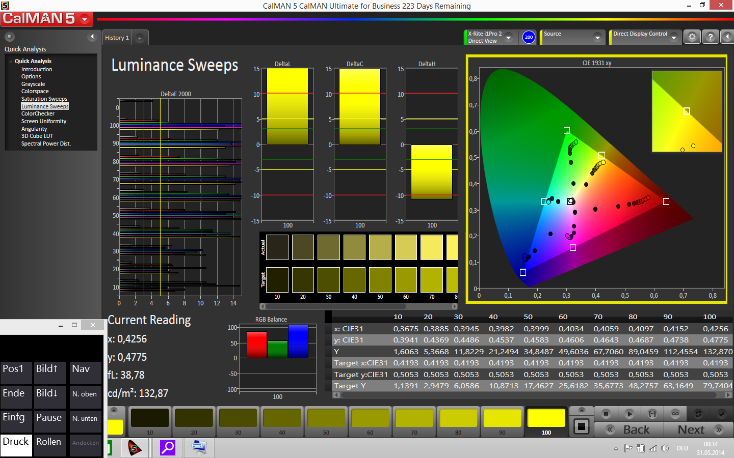 Unsere Messungen mit CalMAN offenbaren auch beim aktuellen Modell korrekt dargestellte Farben im Auslieferungszustand. Die Graustufen sind ab Werk ebenso recht gut justiert, was auch ein niedriges DeltaE von 2 und eine relativ akkurate Farbtemperatur von 6.724 K belegen. Mit bloßem Auge sind auf der Graustufenskala keine Verfärbungen sichtbar. Eine weitere Kalibrierung verbessert dann Farbtreue, Graustufen und Farbsättigung nur geringfügig.