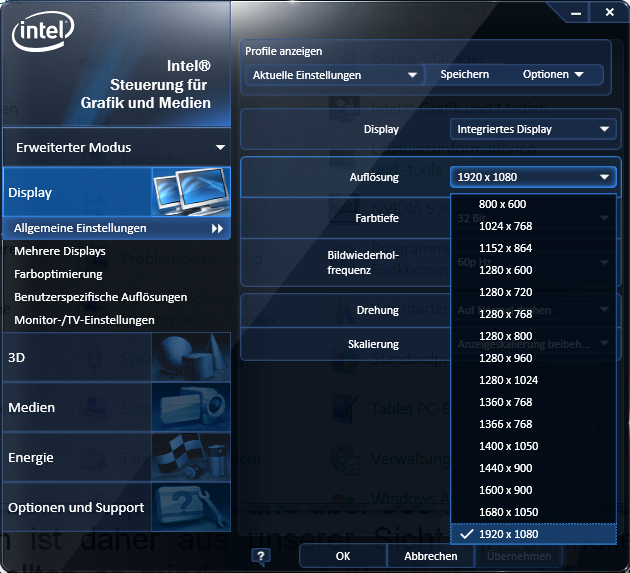 Als Alternative kann man auch die Auflösung des Displays an sich ändern. Hierzu bieten der Nvidia- als auch der Intel-Treiber vielzählige Auflösungsalternativen. Alle verlieren im Gegensatz zur nativen Full-HD-Auflösung mehr oder weniger an Schärfe, wobei die 16:9 Auflösungen noch am besten aussehen. Hier wird die Darstellung im Gegensatz zu den 16:10 und 4:3 Alternativen auch nicht verzerrt. Eine unverzerrte, nicht skalierte Darstellung mit schwarzen Balken ist nicht möglich. Ein Arbeiten mit einer der Auflösungsalternativen ist aus unserer Sicht nicht zu empfehlen. Sollte die Darstellung von Icons, Symbolen und Schriften zu klein sein, fährt man mit der nativen Auflösung in Kombination mit systemeigenen vergrößerten 125 % Darstellung (Systemsteuerung-Anzeige) noch am besten.