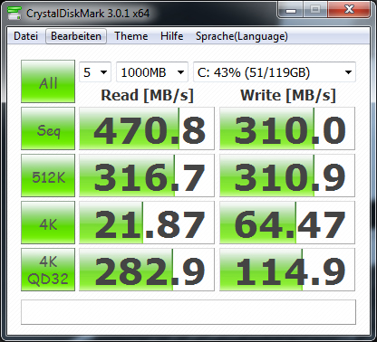 Wie schon angesprochen, haben wir das Aufrüsten mit einem SSD von Samsung getestet. Hier werden deutlich bessere Leistungsdaten erzielt als es die konventionelle Festplatte kann. Knapp 500 MB/s beim seq. Lesen und über 300 MB/s beim seq. Schreiben sind super. Die ideale Kombination ist daher aus unserer Sicht ein schnelles Solid State Drive als Systemlaufwerk (hier sollten es mindestens 128 GB Kapazität sein) und eine zweite leise konventionelle Festplatte als Massenspeicher für Dateien & Co. Ohne Zugriffe unhörbar ist beispielsweise Toshibas MK3265GSX (320 GB), die wir als zweite Festplatte testweise zusammen mit der Samsung SSD eingebaut haben.