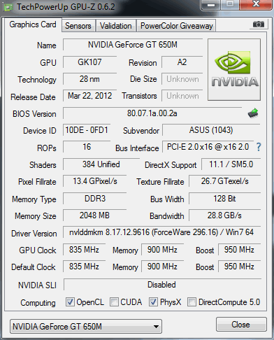 Nvidias Geforce GT 650M baut auf der aktuellen Kepler-Architektur auf und wird im 28-nm-Prozess gefertigt. Geringerer Stromverbrauch bei gleichzeitiger Leistungssteigerung im Vergleich zur Fermi-Generation sollen hier verwirklicht werden. 2 GB dedizierter DDR3 Grafikspeicher, 128 bit Speicherbandbreite, 900 MHz Speichertakt und 835 MHz Kerntakt, der per Turbo auf bis zu 950 MHz erhöht werden kann, versprechen einiges an 3D-Leistung. Im Vergleich zur GT 630M des N76VM werden beim 3D Mark Vantage 8994 : 5541 Punkte, beim 3D Mark 11 2371 : 1288 Punkte und bei Heaven 2.1 26,9 : 16,4 Punkte erzielt. Das sind gute Performancesteigerungen, die auch in der Praxis für eine gute Spieleleistung sorgen sollten.