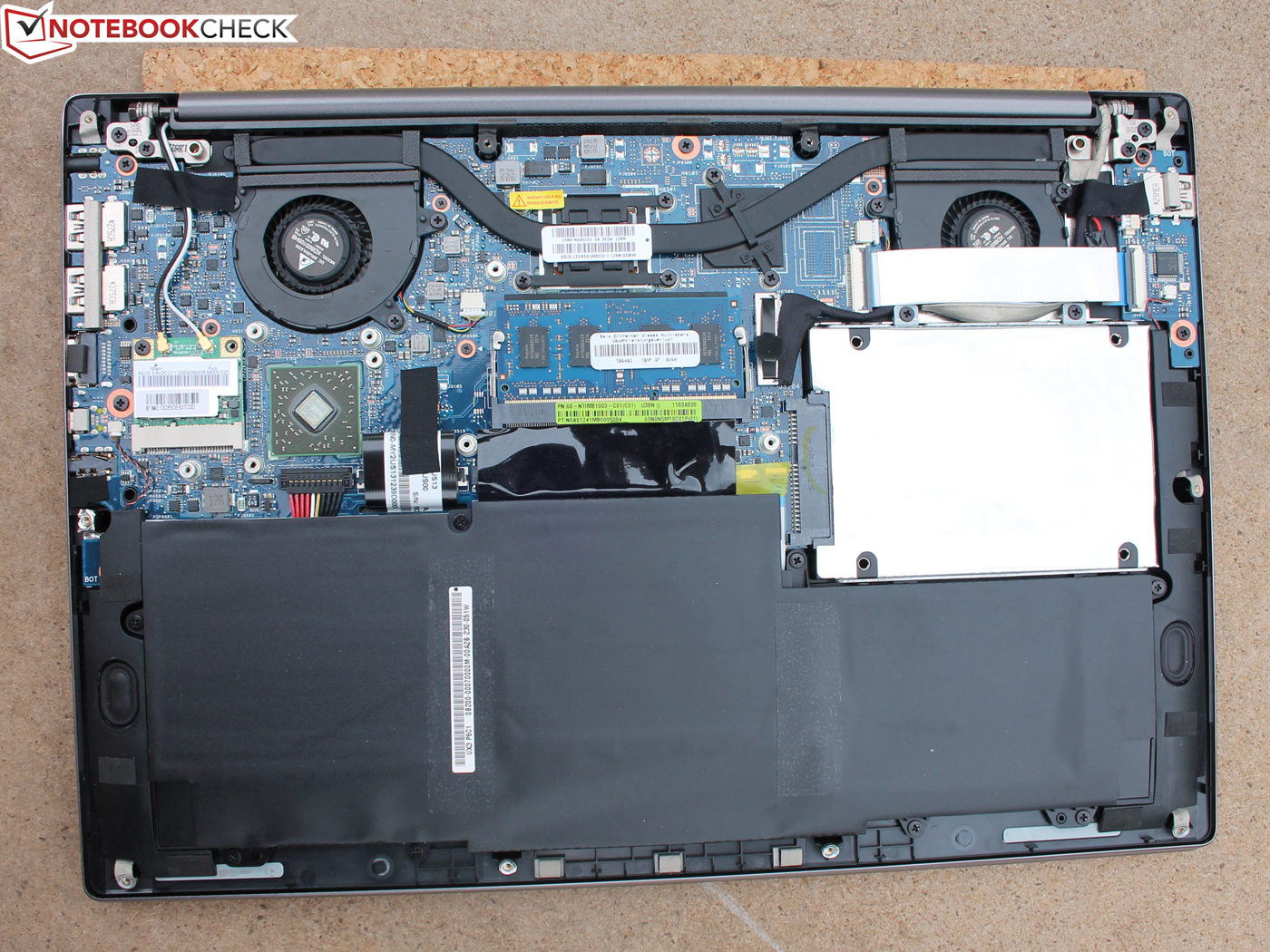 Komplettiert wird die Plattform durch eine SanDisk U100 SSD (128 GB) und durch 4 GB RAM. Letzterer ist zweigeteilt, das heißt 2 GB sitzen fest verlötet auf dem Mainboard, weitere 2 GB sind als Standard SO-DIMM gesteckt. Das Aufrüsten auf 6 oder 10 GB gestaltet sich daher einfach.