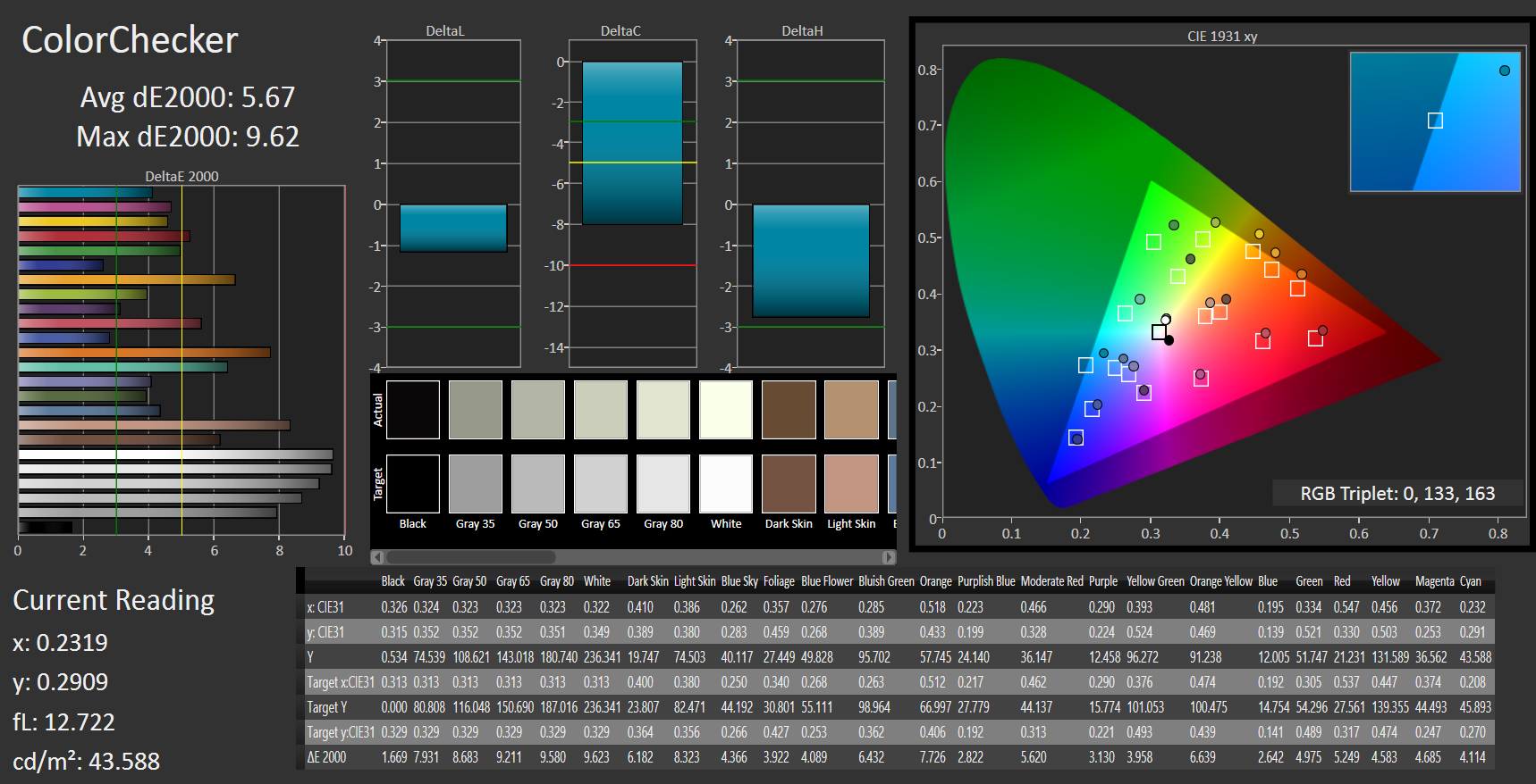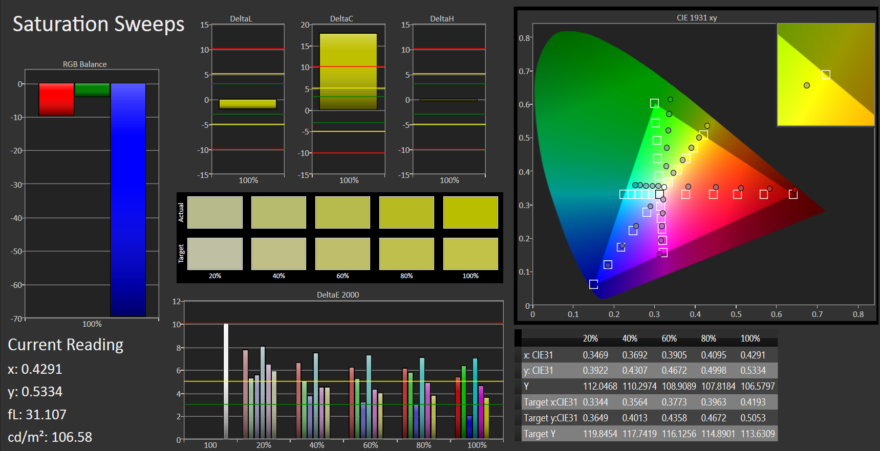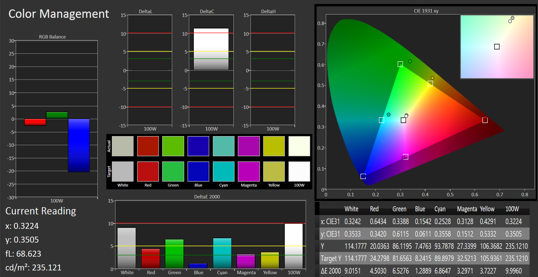 Folgende Screen-Reihe zeigt die Farbanalyse des i1 Pro 2 Fotospektrometers und der CalMAN 5 Software. Vermessen im werkseitigen Zustand ermitteln wir eine leichte Schwäche bei der Darstellung von Grautönen. Das durchschnittliche DeltaE(2000) liegt bei sechs.