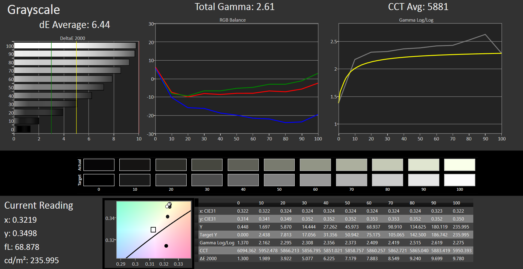 Auffällig: Mit 5.881 K ist der Weißpunkt zwar nahe dem Ideal von 6.500, er ist aber etwas zu stark in den warmen Bereich verschoben. Im Graustufen-Screen ist das mit dem bloßen Auge bei den helleren Weißtönen erkennbar (Beige-Einschlag). Bei den meisten Panels ist das umgekehrt, die liegen über 7.500 und sind zu kühl. Das Panel besitzt also keinen Blaustich, Farben sind merklich warm.