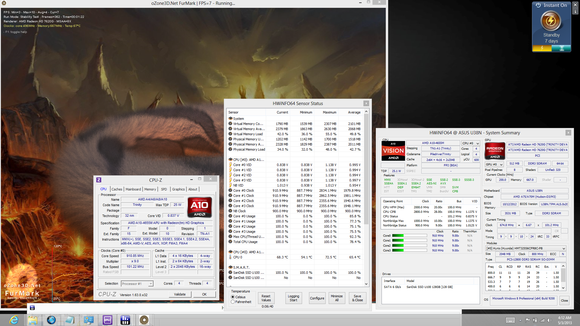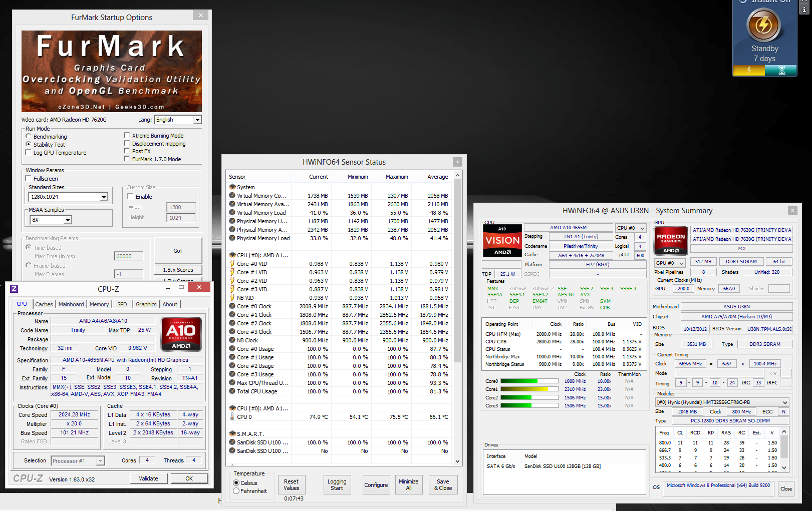 Das beim U38DT festgestellte CPU-Throttling auf 900 MHz tritt bei zeitgleicher GPU-Last (Furmark) erneut auf. Das ist eine Besserung! Beim U38DT reduzierte die A8 APU bereits während normaler CPU-Multi-Benchmarks auf 900 MHz. Dies ist hier nicht mehr so, weshalb die Ergebnisse vglw. hoch abschneiden (siehe oben: Prozessorleistung).