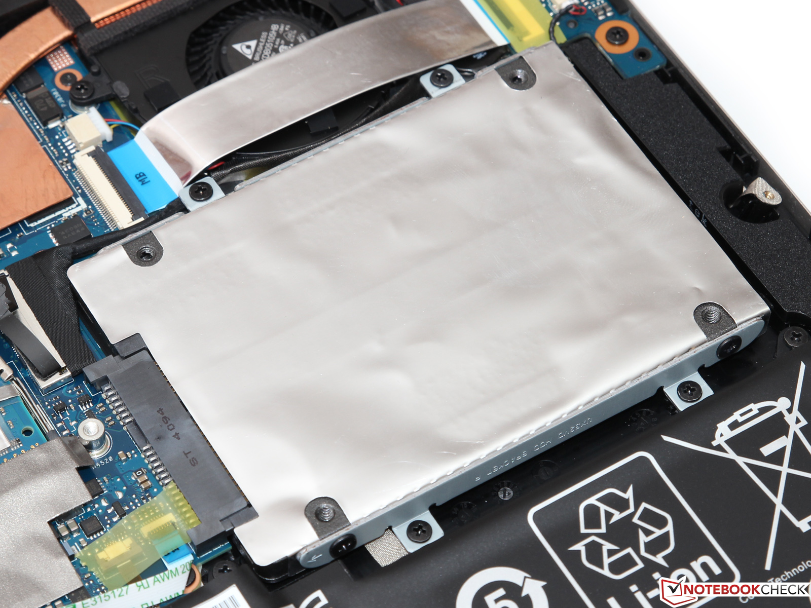 Das Zenbook ist mit der gleichen Kingston-SSD bestückt, die auch im Schwestermodell UX32LN-R4053H steckt. Die SSD bietet eine Kapazität von 256 GB. Wie üblich bei Notebooks der Firma Asus ist die SSD in eine Betriebssystem- (95 GB) und eine Datenpartition (121 GB) unterteilt. Die SSD liefert ordentliche Transferraten, mit den aktuellen Top-Modellen unter den SSDs kann sie aber nicht mithalten. Wer die SSD gegen ein schnelleres Modell bzw. ein Modell mit mehr Speicherkapazität tauschen möchte, kann dies machen. Bei der verbauten SSD handelt es sich um ein handelsübliches Modell im 2,5-Zoll-Format.