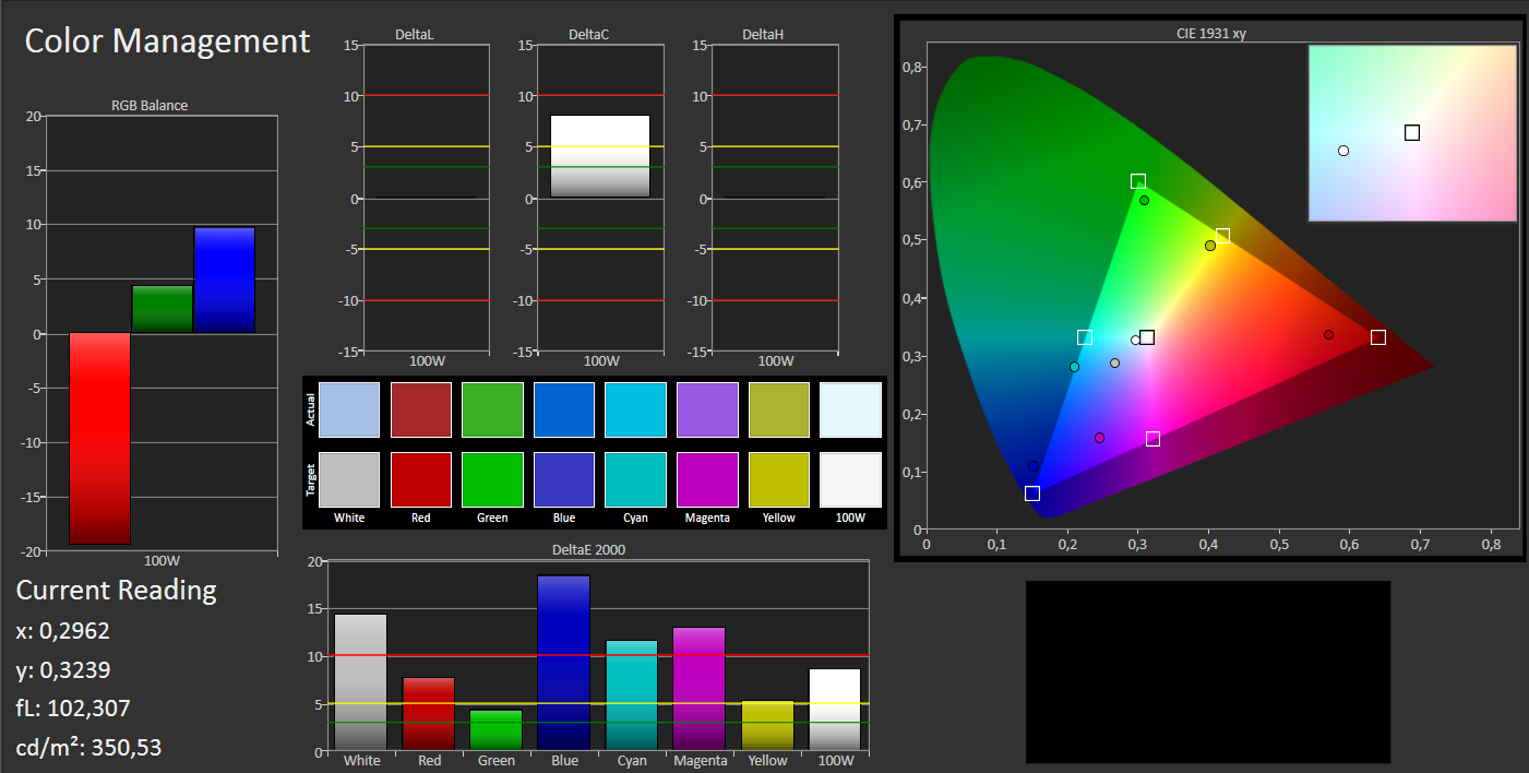 Die Treffsicherheit bei den Farben profitiert gleichfalls von einer Kalibrierung des TFTs. Während Cyan und Magenta mit einem DeltaE von 13/12 deutlich sichtbar abweichen, fällt Blau mit 18 ganz von der Rolle (starker Blaustich). Diese Werte vermindern sich bei Kalibrierung auf 8/2 und 15. Der Blaustich bleibt also bestehen, Magenta (auch Gelb, Grün und Rot) wird aber näher am Zielfarbraum abgebildet.