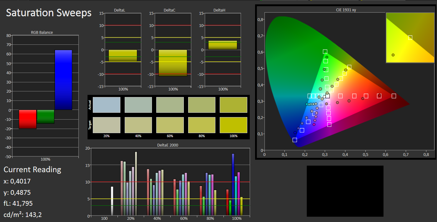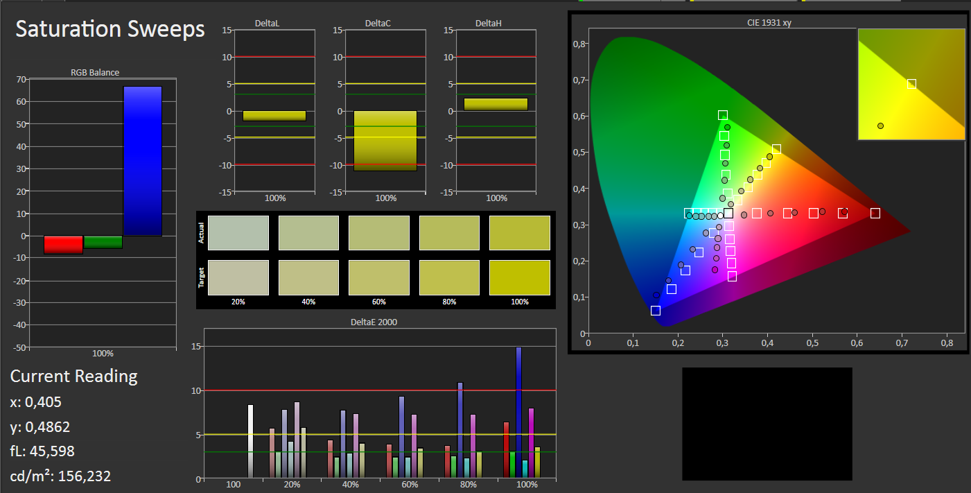 Wir haben die Messung einmal vor (jeweils 1. Bild) und nach der Kalibrierung durchgeführt (jeweils 2. Bild). Die Graustufen zeigen, speziell bei den mittleren Tönen, eine hohe DeltaE Abweichung von 11. Grau sieht also nicht so aus, wie es nach sRGB aussehen sollte. Eine Kalibrierung nützt, sie drückt den durchschnittlichen DeltaE 2000 auf 5. Die dunklen Graustufen werden jetzt sehr gut dargestellt.