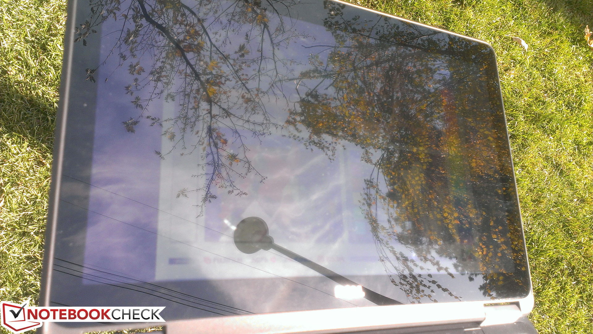 Auch im Außeneinsatz schlägt sich die Touchscreen-Variante besser als das normale E7240, allerdings gibt es einige Dinge zu beachten. Aufgrund der Schutzschicht aus Gorilla-Glas ist die Anzeige spiegelnd und nicht mehr matt, wie es noch beim normalen E7240 der Fall war. Um den störenden Spiegelungen entgegenzuwirken, benötigt man eine stärkere Hintergrundbeleuchtung (und damit auch mehr Strom). Des Weiteren sinkt die maximale Helligkeit der Touchscreen-Variante im Akkubetrieb von 388,6 cd/m² auf 322,9 cd/m², selbst bei der Auswahl des Höchstleistungsprofils. Daher kann der Betrieb unter direktem Sonnenlicht auch recht anstrengend sein, und man sollte sich nach Möglichkeit ein schattiges Plätzchen suchen. Für Innenräume, wie z. B. der Wohnung oder dem Büro, reicht die Helligkeit aber locker aus.
