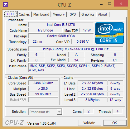 Das Testmodell ist mit einem Core i5-3337U Zweikernprozessor ausgestattet. Dagegen bieten andere Konfigurationen eine i5-3317U, i7-3517U oder die hochwertigere i7-3537U. Diese Intel Kerne sind wegen ihres relativ niedrigen Stromverbrauchs häufig in ultradünnen Notebooks, einschließlich dem Asus Zenbook UX32VD und Samsung-Serie-9-Modellen, anzutreffen. Davon abgesehen handelt es sich bei allen um 22-nm-Ivy-Bridge-ULV-zwei-Kern-CPUs mit 17 W TDP, also halb so viel wie ihre Standard-Volt-Gegenstücke. Außer etwas höheren Basistaktraten sind die Hauptvorteile von ULV-i7-Kernen gegenüber ULV-i5-CPUs ein größerer L3-Cache (4096 KB vs. 3072 KB) und ein potentiell höherer Turbo-Takt (bis zu 3000-3100 MHz vs. 2500-2700 MHz). Daher werden Alltagsaufgaben wie Web-Browsen und Videos bestenfalls marginal von dem höherem Aufwand der i7-Modelle profitieren. Beim i5-3337U in unserem Testgerät handelt es sich um ein Upgrade des i7-2637M im Vorgängermodell. Er arbeitet mit einem Basistakt von 1800 MHz und einem Idle-Takt von 800 MHz im Energiesparmodus. Weitere Informationen und Benchmarks zum i5-3337U sind auf unseren CPU-Spezialseiten hier verfügbar.