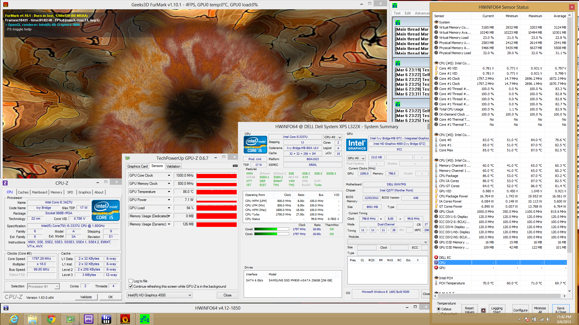 Bei ausschließlichem GPU-Stress mit FurMark läuft die integrierte GPU vorerst mit ihrem maximalen Takt von 1100 MHz. Anders als bei der CPU fällt der Takt jedoch schnell und stabilisiert sich bei 1000 MHz. Es zeigt sich also, dass die GPU ihren maximalen Turbo-Boost nicht länger als höchstens 1 bis 2 Minuten nutzen kann. Der Geschwindigkeit des Systemlüfters steigt rasch und die Kerntemperatur erreicht 84 Grad Celsius.