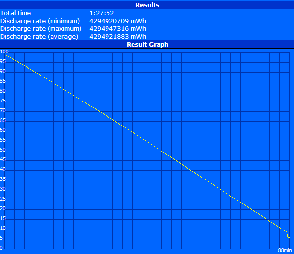Die minimale Akkulaufzeit wird mit Höchstleistungsprofil bei maximaler Helligkeit mit dem Battery Eater Classic Test aufgezeichnet. Der automatische Shutdown erfolgt nach ungefähr 1 Stunde und 30 Minuten. Dieser Wert ähnelt den beiden XPS-13-Modellen mit TN 720p Panels.