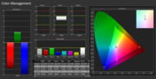 Der Bildschirm wird ferner mit einem i1 Basic Pro 2 Spektralprofiler analysiert. Mit etwas über 6000K ist die Farbtemperatur im Auslieferungszustand etwas hoch. Die vermessenen Grundfarben zeigen niedrige Abweichungen von DeltaE < 5, die Grausstufen weichen im Bereich mit hohem Weißanteil etwas stärker ab. Insgesamt verteilen sich die Abweichungen mehr oder weniger gleichmäßig auf alle Farben und sind bei den getesteten Sättigungen sehr klein.