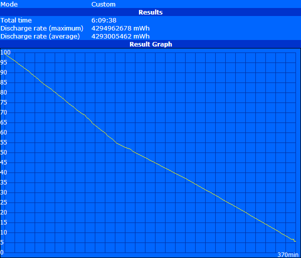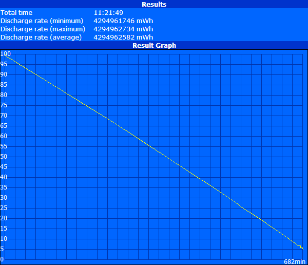 Bei minimaler Last (minimale Helligkeit, Energiesparmodus, WLAN deaktiviert) erreicht das Notebook eine absolut anständige Laufzeit von 11 Stunden und 22 Minuten, was rund eineinhalb Stunden über dem zuvor getesteten i5-Modell liegt. In dem anderen Extremszenario, der maximalen Auslastung (maximale Helligkeit, Höchstleistungsmodus, WLAN aktiviert, Battery Eater Pro Classic Test), muss das Gerät schon nach 1 Stunde und 33 Minuten zurück an die Steckdose, eine ganze Stunde früher als das i5-Modell.