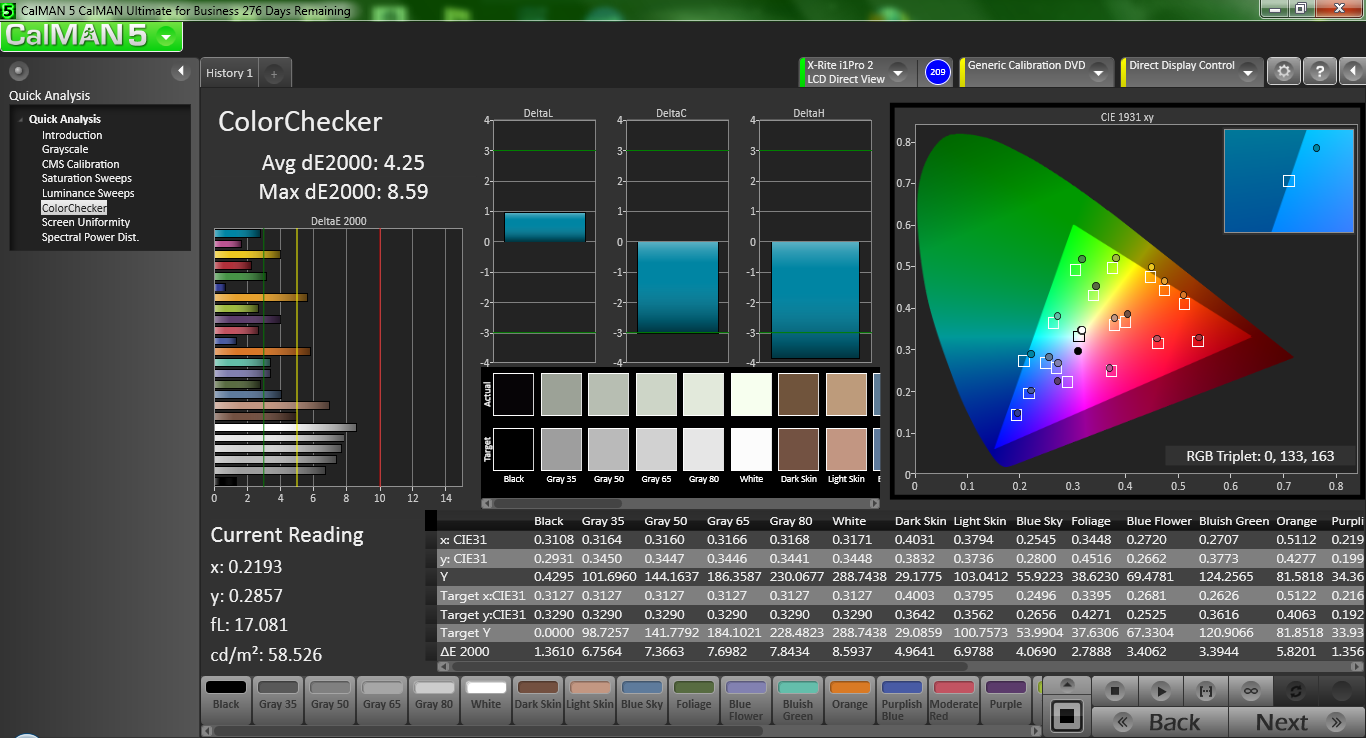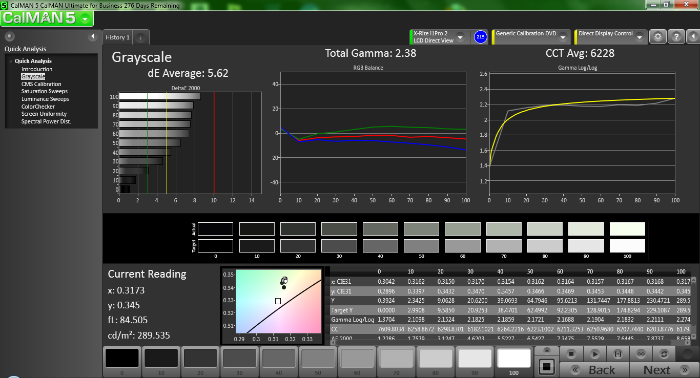 Unsere Messungen mit CalMAN 5 bestätigen, dass das Display einen optimalen Wert für die Farbgenauigkeit im Lieferzustand nur knapp verfehlt. Die durchschnittliche DeltaE-Abweichung von 5,08 (ideal: 0) suggeriert lediglich eine geringe Abweichung des gesamten Spektrums, wobei die größten Ausreißer bei Grau liegen. Die maximale DeltaE-Abweichung ist 9 für 80 % Grau. Der Gammawert von 2,62 ist etwas hoch (ideal: 2,2) mit einer etwas zu warmen Farbtemperatur von 5.997.
