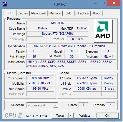 In unserem Testgerät steckt eine AMD A8-6410 APU (Beema). Der Vierkernprozessor der APU arbeitet mit einer Basisgeschwindigkeit von 2 GHz. Mittels Turbo kann die Geschwindigkeit auf bis zu 2,4 GHz gesteigert werden. Mit einer TDP von 15 Watt gehört die APU zu den sparsamen Vertretern ihrer Art. Im Netzbetrieb steht praktisch die volle CPU-Leistung zur Verfügung: Während die Single-Thread-Tests der Cinebench Benchmarks mit 2,4 GHz bearbeitet werden, begeht die CPU die Multi-Thread-Tests mit 2 bis 2,2 GHz. Im Akkubetrieb konnten wir minimal langsamere Geschwindigkeiten feststellen (Single: 2,2 bis 2,4 GHz; Multi: 1,8 bis 2 GHz).