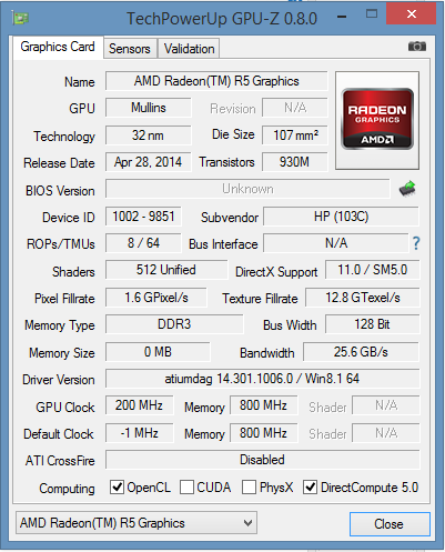 AMDs Radeon R5 (Beema) Grafikkern zeichnet sich für die Grafikausgabe verantwortlich. Die GPU unterstützt DirectX 11.2 und arbeitet mit Geschwindigkeiten bis zu 800 MHz. Die 3D Mark Benchmarks zeigen, dass der Kern leistungsmäßig praktisch auf einer Höhe mit dem im Pavilion-Schwestermodell verbauten HD Graphics 4400 Grafikchip liegt. Eine leichte Leistungssteigerung durch den Dual-Channel-Modus wäre bei beiden Pavilion-Modellen nicht möglich, da sie beide nur mit jeweils einer Arbeitsspeicherbank bestückt sind. Dieser Kniff wäre beim Pavilion 13-a093na aber auch bei vorhandener zweiter Arbeitsspeicherbank nicht möglich, da die verbaute APU nur den Single-Channel-Modus unterstützt.