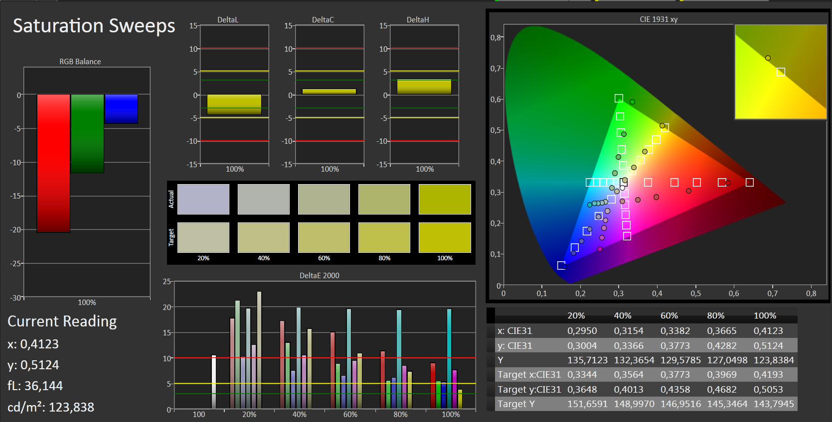 Auch die Farbwerte des Bildschirms wissen nicht zu beeindrucken. So liegt die durchschnittliche DeltaE-2000-Abweichung im Auslieferungszustand bei einem Wert von 12. Den Zielbereich (DeltaE kleiner 3) erreicht keine Farbe. Zudem weist der Bildschirm einen Blaustich auf. Dieser kann mittels Kalibrierung beseitigt werden.