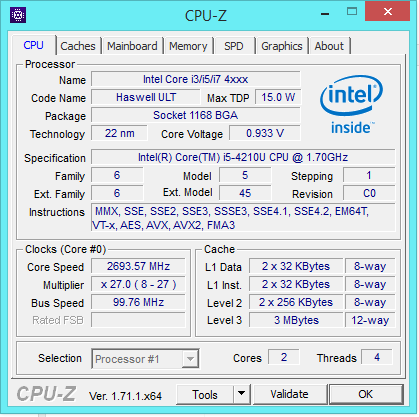 Bei dem im Probook 430 G2 verbauten Core i5-4210U Zweikernprozessor handelt sich um eine etwas schneller getaktete Variante des im Probook 430 G1 verbauten Core i5-4200U Prozessors. Die einzelnen Taktstufen liegen um 100 MHz höher. Der Core i5-4210U arbeitet somit mit einer Basisgeschwindigkeit von 1,7 GHz. Eine Steigerung auf 2,4 GHz (beide Kern) bzw. 2,7 GHz (ein Kern) ist mittels Turbo möglich. In der täglichen Praxis ist dieser minimale Geschwindigkeitsvorsprung gegenüber dem Core i5-4200U nicht zu spüren. Im Akkubetrieb nutzt das Probook den Turbo seines Prozessors nicht. Die CPU-Tests der Cinebench Benchmarks werden mit konstanten 1,7 GHz durchlaufen. Im Netzbetrieb werden alle Turbostufen voll genutzt.