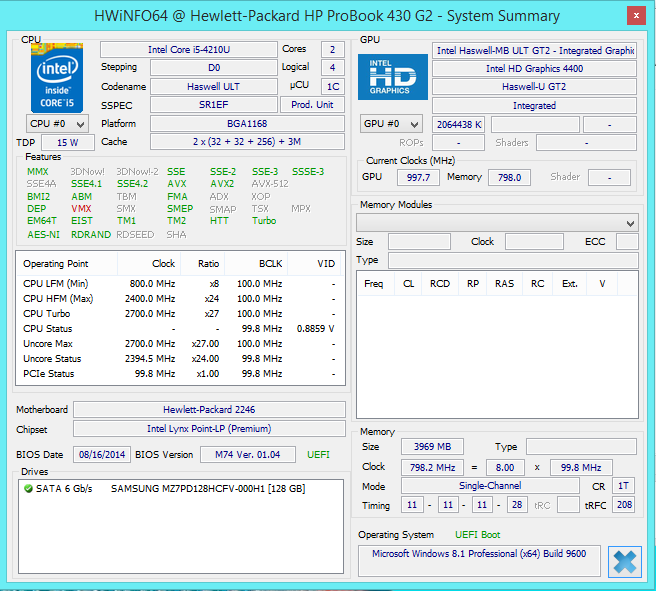 | HP Probook 430 G2 HD Graphics 4400, 4210U, Samsung SSD 840 PRO MZ7PD128HCFV-000H1 | HP ProBook 430-G1 HD Graphics 4400, 4200U, Hitachi Travelstar Z5K500 HTS545050A7E380 | Dell Latitude 13 3340 Education Series HD Graphics 4400, 4200U, Seagate ST500LM000 Solid State Hybrid Drive | Asus ASUSPRO Essential PU301LA-RO064G HD Graphics 4400, 4500U, Toshiba MQ01ABF050 | Acer Aspire V3-371-38ZG Iris Graphics 5100, 4158U, Kingston RBU-SC100S37240GE | Fujitsu Lifebook E544 HD Graphics 4600, 4210M, Seagate ST500LM000 Solid State Hybrid Drive | Lenovo ThinkPad L440 20AT004QGE HD Graphics 4600, 4300M, Intel SSD 520 Series SSDSC2BW180A3L | |