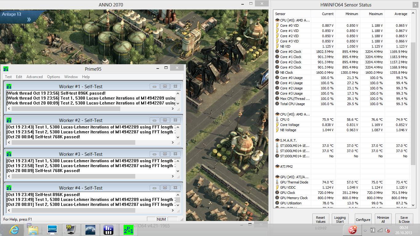 Da der sonst für unseren Stresstest genutzte FurMark mit dem Crossfire-Gespann nicht so recht zusammenarbeiten wollte, haben wir das Programm für diesen Test durch Anno 2070 ersetzt. In Kombination mit dem CPU-Tool Prime95 treibt dies die A10-APU bis auf eine Temperatur von unkritischen 76 °C (HD 8570M nicht auslesbar). Gleichzeitig sinkt der durchschnittliche Prozessortakt aber auf unter 1,2 GHz (Update: 1,8 GHz mit BIOS V2.05) ab – auch dies dürfte mit dem zuvor erwähnten Software-/BIOS-Problem zusammenhängen und nicht auf thermisches Throttling zurückzuführen sein. Die Radeon HD 8650G hält dagegen stabil ihren maximalen Turbo von 720 MHz und liefert demzufolge weiterhin die volle Performance.
