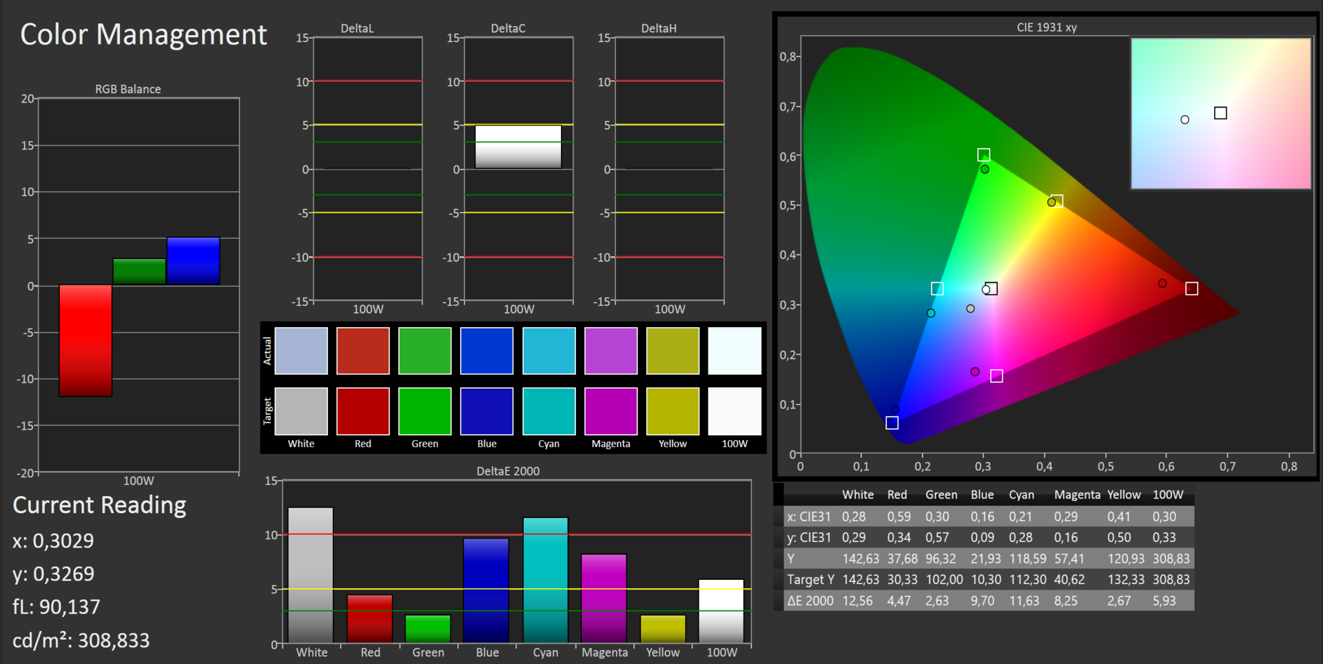 Ebenfalls deutliche Abstriche muss man bei der Farbraumabdeckung hinnehmen. Die Schnittmenge zwischen den darstellbaren Farben und dem sRGB-Farbraum beträgt etwa 80 %. Der Abstand hin zum Ideal wirkt sich auch auf die Farbgenauigkeit aus. Während die Unterschiede im Auslieferungszustand wie so oft recht groß ausfallen, kann eine Kalibrierung vor allem beim zu dünnen Blau- und Magenta-Bereich keine Wunder bewirken. Mit einem DeltaE 2000 von 6,8 und 5,9 bleiben die Abweichungen nach der Kalibrierung für ein farbgenaues Arbeiten zu groß. Besser sieht es dagegen bei den Mischfarben aus. Hier können die schwächer ausgebildeten Grundfarben gut ausgeglichen werden, was sich in einem sehr guten durchschnittlichen DeltaE 2000 von 1,07 äußert. Gut sind auch die Graustufenauflösung, die Gammakurve und die RGB-Balance.