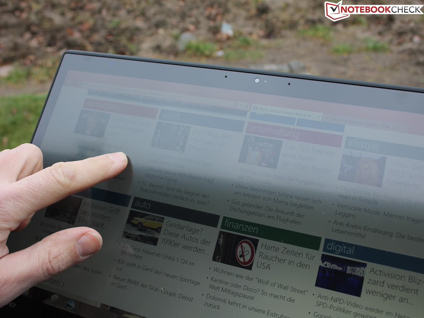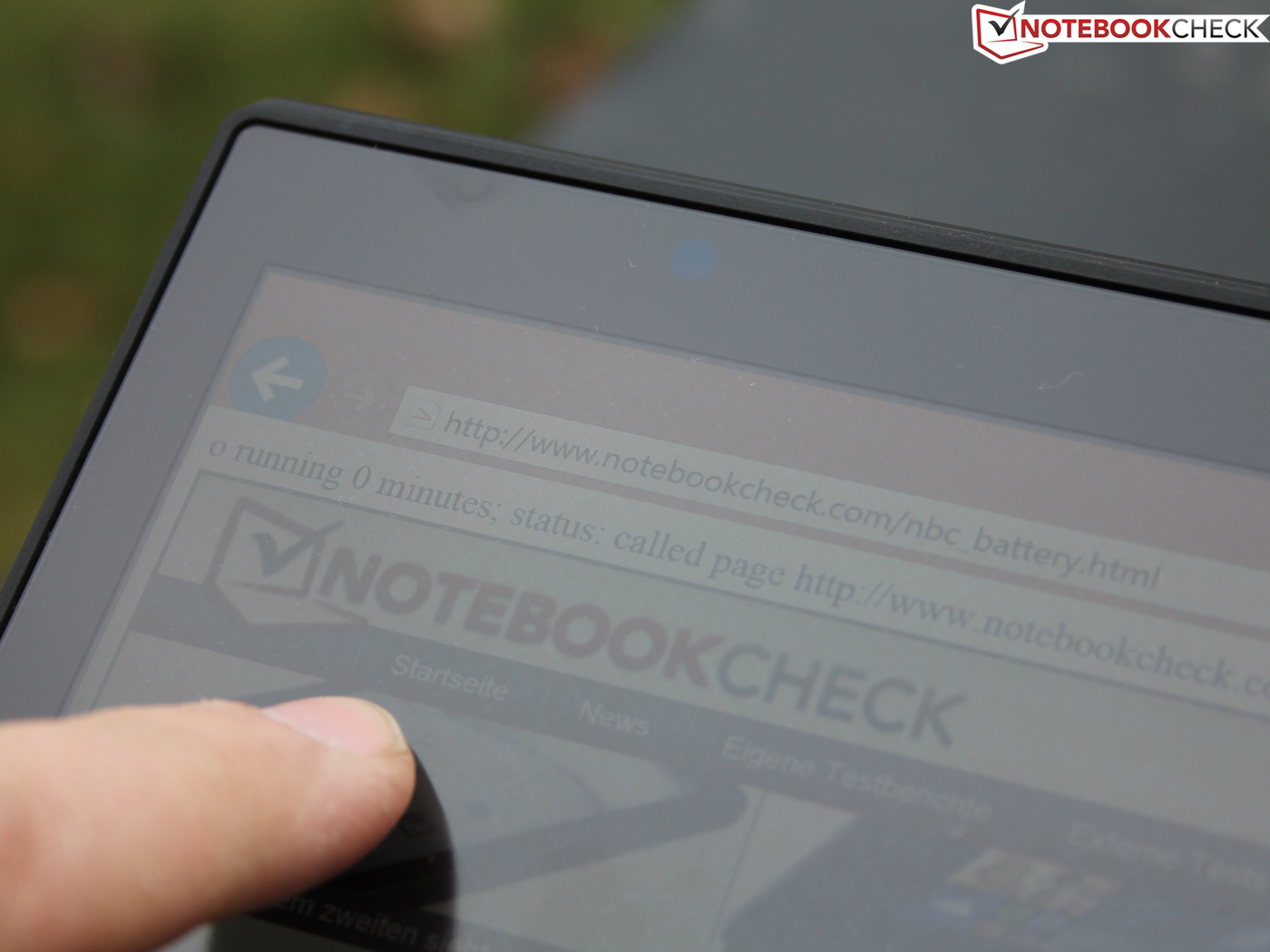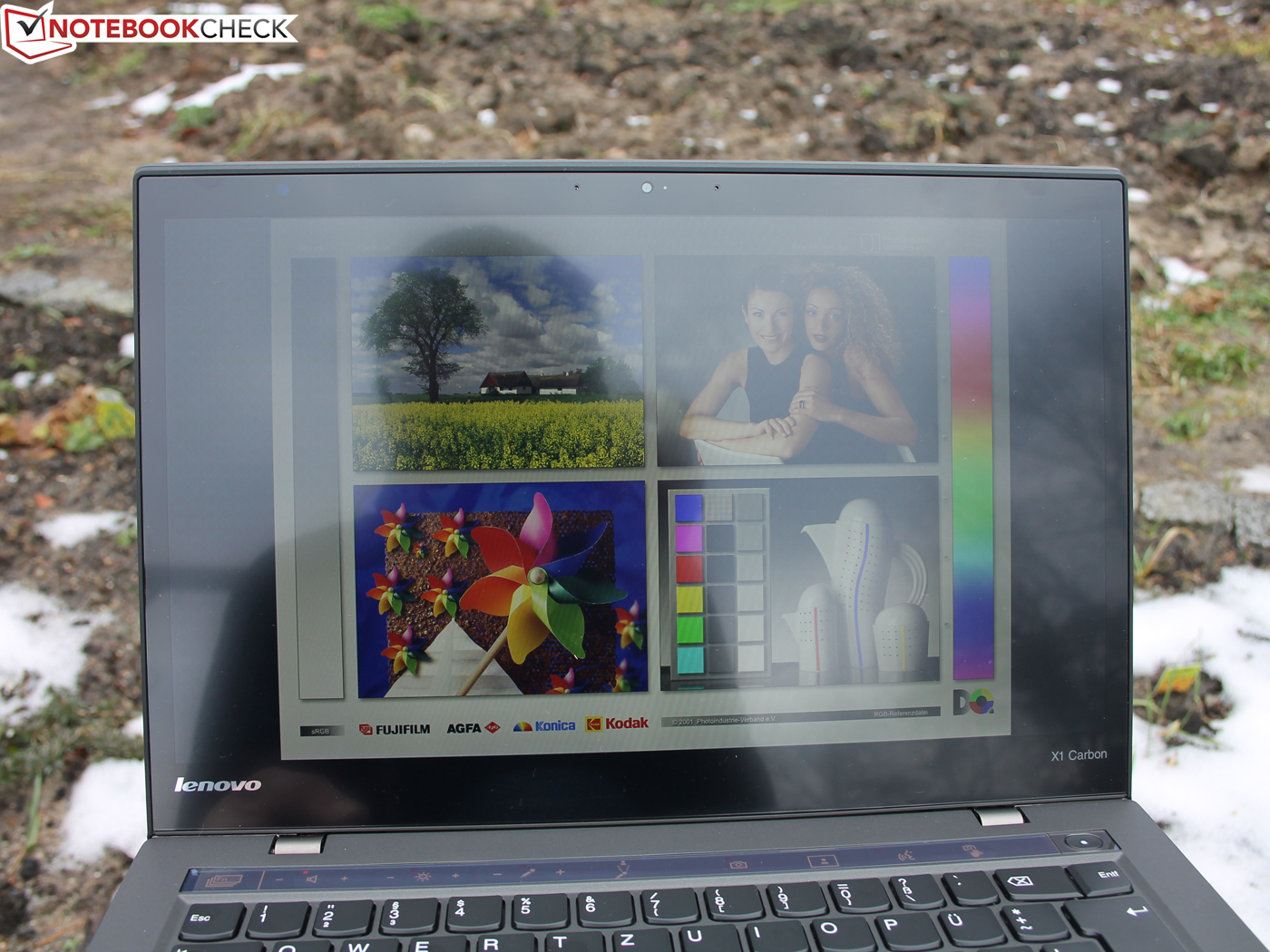 Obwohl Lenovo von einem Touchscreen mit "AntiGlare"-Oberfläche spricht, reflektiert das Display einen nicht unerheblichen Teil des Umgebungslichtes. Speziell im Außeneinsatz erschwert dies in Kombination mit der zu schwachen Hintergrundbeleuchtung die Lesbarkeit, sodass der Anwender einen möglichst schattigen Arbeitsplatz bevorzugen sollte. Besser als ein vergleichbar helles Glossy-Panel schlägt sich das semi-matte X1 Carbon aber auf jeden Fall.