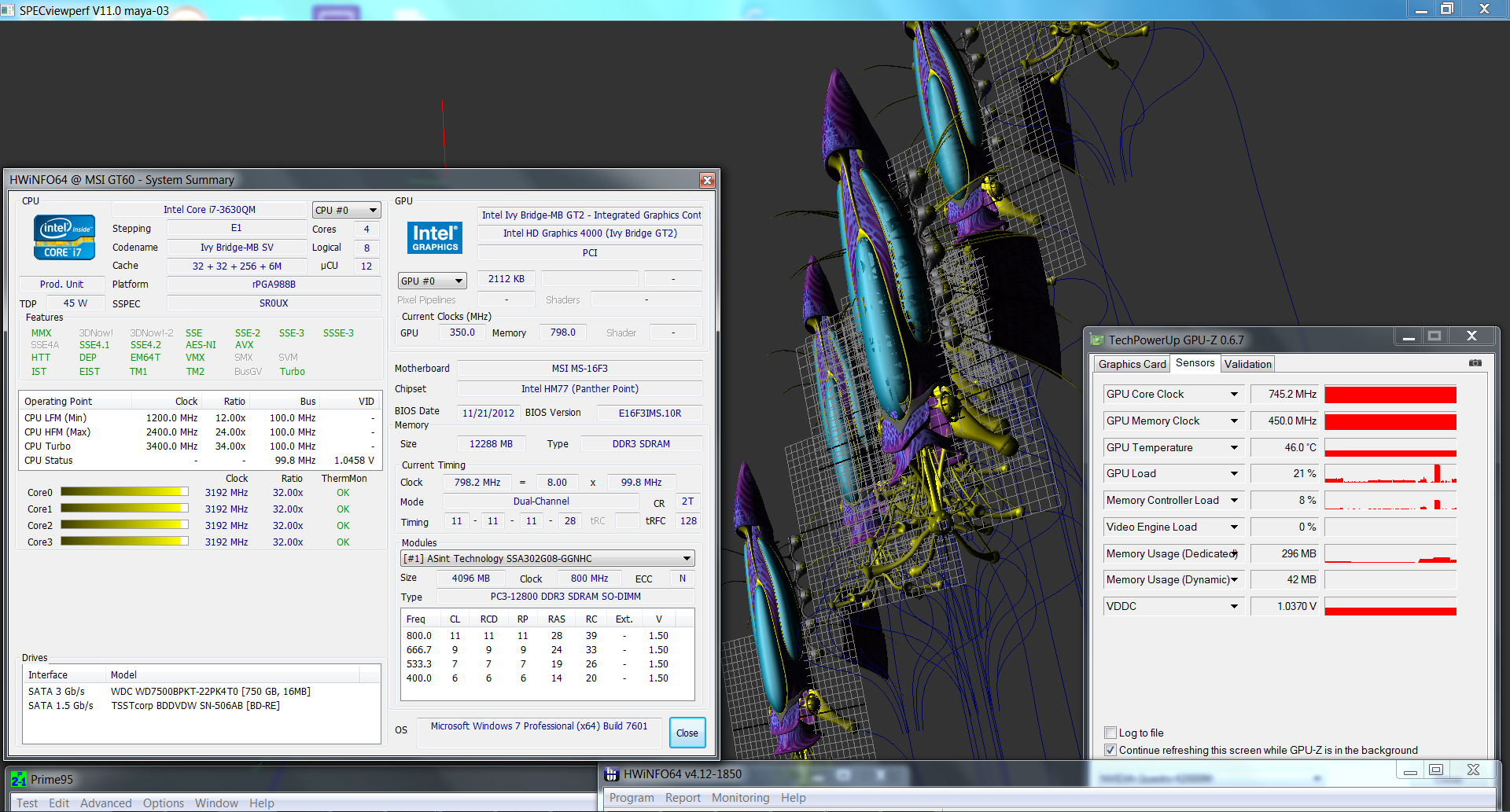Specviewperf 11 und Prime95 wurden neben der Monitor-Software HWiNFO, CPU-Z und GPU-Z benutzt, um auf Throttling-Probleme zu testen. Unser üblicher GPU-Stress-Benchmark, FurMark, weigerte sich, auf der eigenständigen K2000M zu laufen.