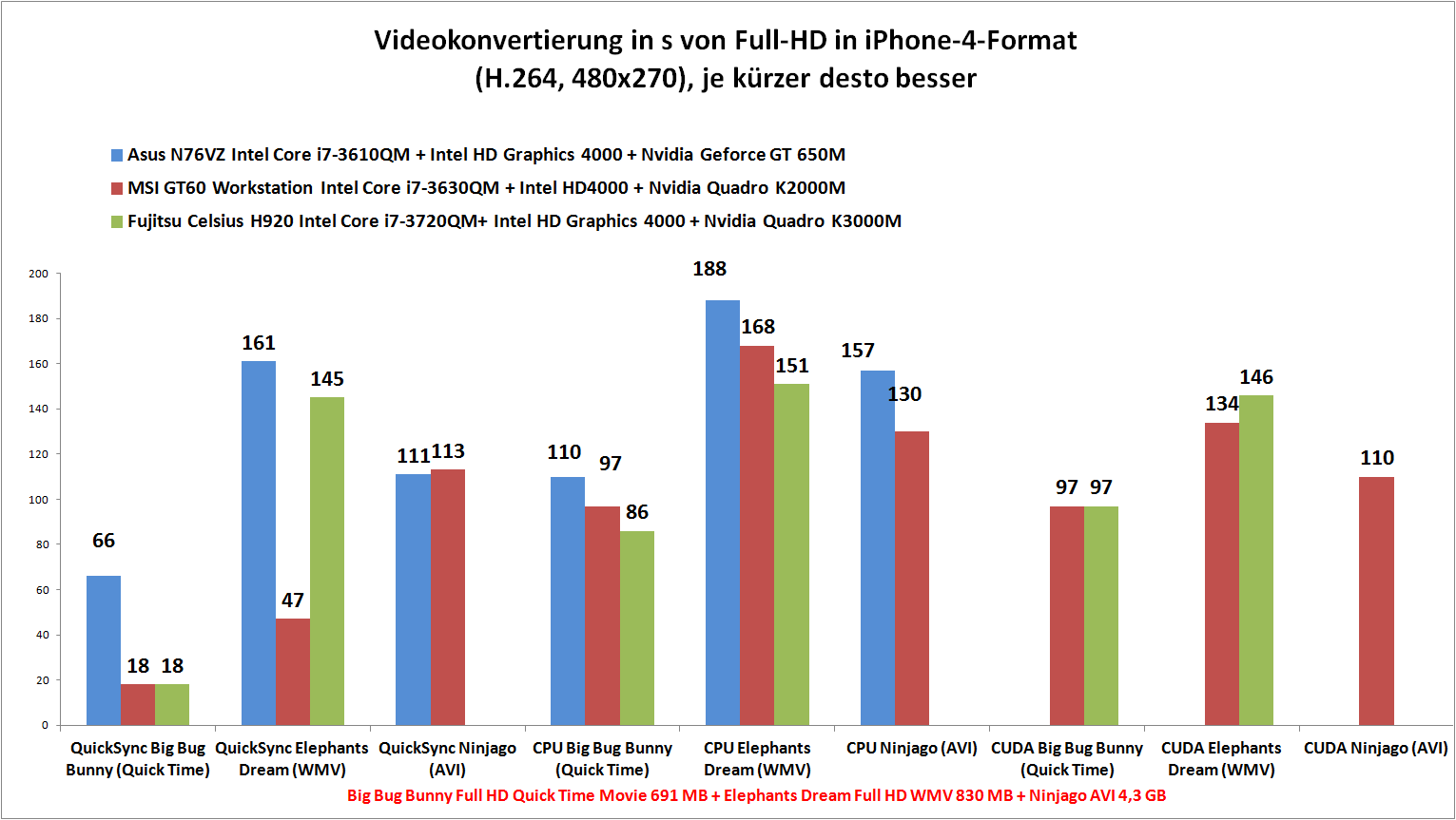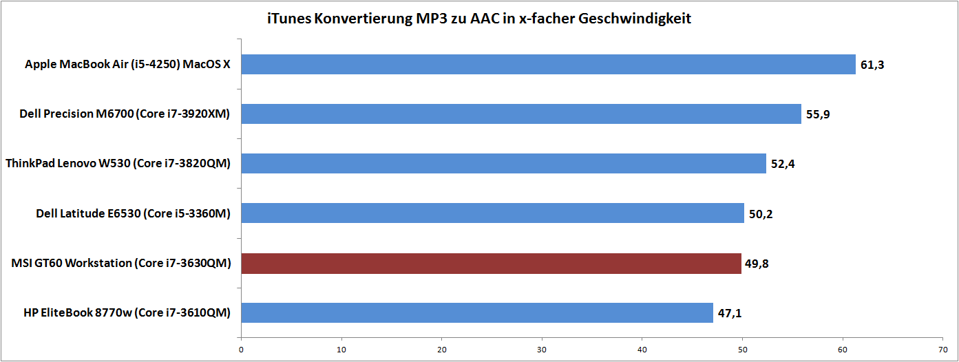 Beim Cinebench R10 64 bit werden beispielsweise 5.756 Punkte (Single) und 22.031 Punkte (Multi) erzielt. Im Praxistest haben wir MP3-Files per iTunes zu AAC konvertiert und eine 49,8-fache Geschwindigkeit erreicht. Mit Cyberlinks MediaEspresso wurden zudem verschiedene Videos in ein iPhone-kompatibles Format umgewandelt. Bei der reinen CPU-Konvertierung ordnet sich die Intel Core i7-3630QM zwischen Intel Core i7-3610QM und Intel Core i7-3720QM ein. Deutlich schneller, bei gleichzeitig geringerer Prozessorlast, gelingt die Umwandlung, wenn eine der GPUs beauftragt wird.