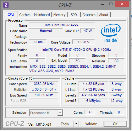 Mit dem Core i7-4700HQ Prozessor (Haswell) steckt eine leistungsfähige Vierkern-CPU in dem Satellite. Der Prozessor arbeitet mit einer Basisgeschwindigkeit von 2,4 GHz. Mittels Turbo kann die Geschwindigkeit auf 3,2 GHz (vier Kerne), 3,3 GHz (zwei Kerne) bzw. 3,4 GHz (ein Kern) beschleunigt werden. Es handelt sich hierbei um einen herkömmlichen Mobilprozessor (kein ULV) mit einer TDP von 47 Watt. Die volle Rechenleistung könnten wir nicht ganz abrufen. Die Single-Thread-Tests der Cinebench Benchmarks bearbeitet die CPU mit 2,8 bis 3,3 GHz, die Multi-Thread-Tests werden mit 2,8 GHz begangen. Im Akkubetrieb werden beide Tests mit 2,4 GHz bearbeitet.