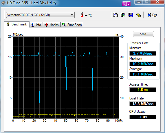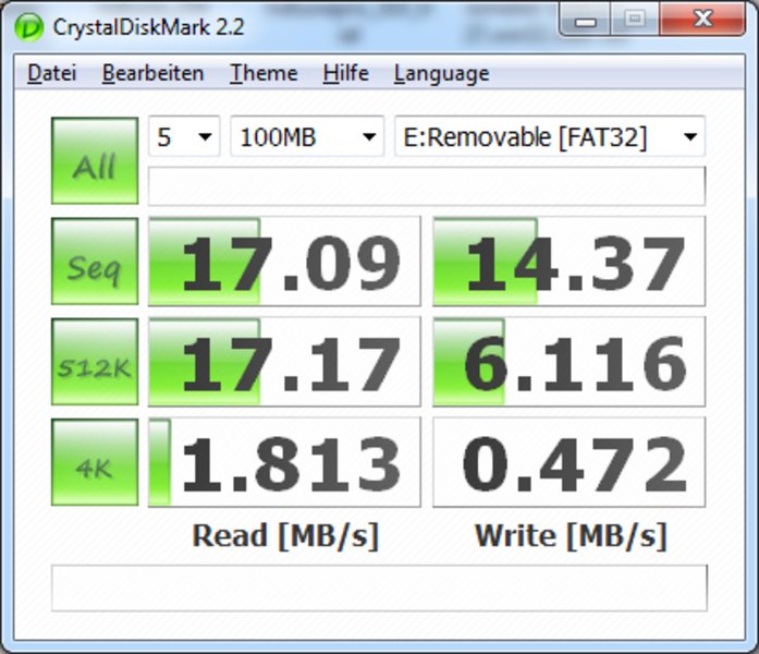 Verbatim verspricht Übertragungsraten von bis zu 30 MB/s beim Lesen und 12 MB/s beim Schreiben. Wir haben dies mit HD Tune und CrystalDiskMark getestet und können zumindest die Schreibraten bestätigen, die beim sequentiellen Schreiben maximal sogar über 14 MB/s erreichen und damit die Herstellerangabe toppen. Beim Lesen erzielten wir maximal 17 MB/s. Das ist weit unter den versprochenen 30 MB/s und enttäuscht uns dann doch. Für bessere Stimmung sorgen wiederum die schnellen Zugriffszeiten von 1,6 ms, die sich vor allem bei portable Apps und Betriebssystemen bemerkbar machen. Unser OCZ ATV Stick, der allerdings auch nur über 4GB Kapazität verfügt, erzielte im Vergleich gute 27,8 MB/s beim Lesen und lieferte ebenfalls gute Zugriffszeiten von 0,8 ms.