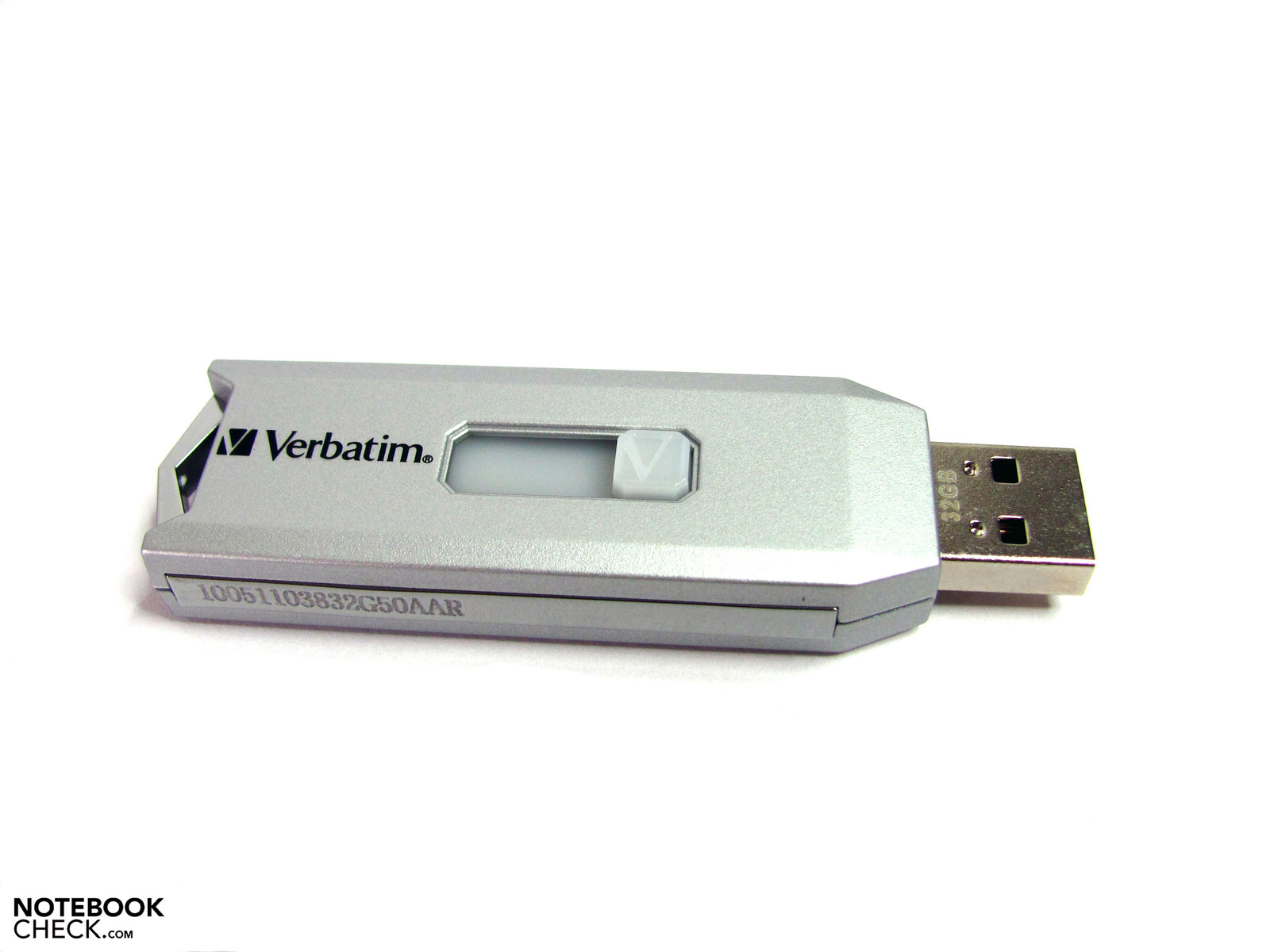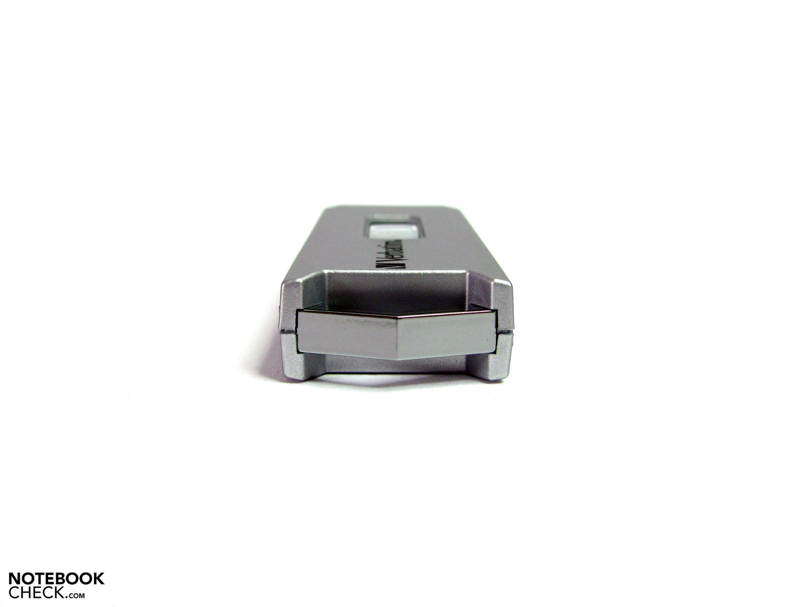 Das Gehäuse kommt im kantigen und farblich zurückhaltenen Alulook, besteht aber aus Kunststoff, und ist mit 11g Gewicht sehr leicht. Ein OCZ ATV Stick bringt beispielsweise fast das doppelte auf die Waage. Die Maße liegen mit 62x 21x 10 mm im üblichen Rahmen. Besonderheit des Verbatim Sticks ist der versenkbare USB-Port, der über einen Schieberegler ein- und ausgefahren werden kann.