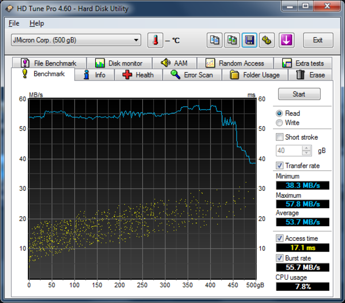 Nahezu identische Werte haben wir mit CrystalDisk Mark 2.2 unter Windows 7 auch am HP ProBook 6540b zusammen mit der FireWire 800 ExpressCard festgestellt. Bei HD Tune wurden maximal 57,8 MB/s an Transferrate erreicht. Für Firewire 800 sind dies insgesamt übliche Werte, die sich vor allem gegenüber den Mac Alternativen FW 400 und USB 2.0 deutlich absetzen können. Für Windows User ist diese Schnittstelle eigentlich nicht interessant, da diese serienmäßig in keinem Rechner zu finden ist und dementsprechend separat nachgerüstet werden müsste. Die Stromversorgung gelang am Mac ohne zusätzliche USB 2.0 Versorgung, im Zusammenspiel mit der ExpressCard musste diese jedoch eingestöpselt werden.