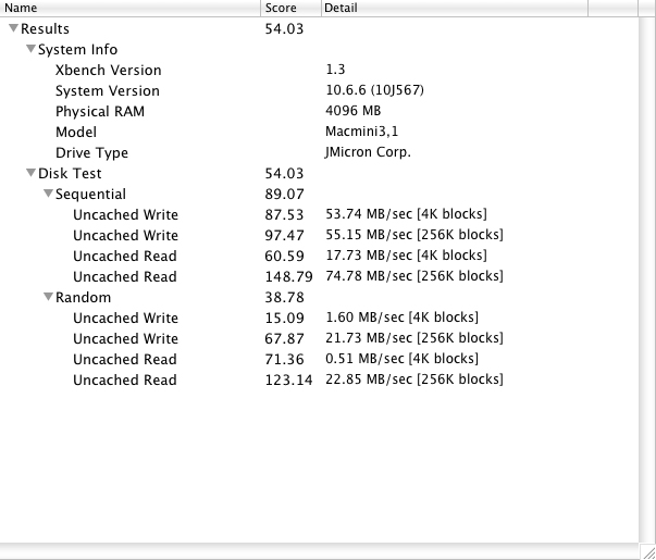 Die mit Xbench 1.3 ermittelten Geschwindigkeiten am Mac spiegeln die derzeitige Leistungsfähigkeit von FireWire 800 wider. Mit knapp 80 MB/s beim sequentiellen Lesen ist die bisher von uns ermittelte Leistungsfähigkeit der FireWire 800 Schnittstelle auch ausgeschöpft. Deutlich darunter liegt der Wert für das sequentielle Schreiben mit 54 MB/s. Dies ist ungewöhnlich, da die Schreibraten normalerweise auf ähnlichem Niveau liegen sollten. Eine LaCie Quadra d2 oder eine Iomega Black Belt erreichen beispielsweise auch beim Schreiben um die 80 MB/s.