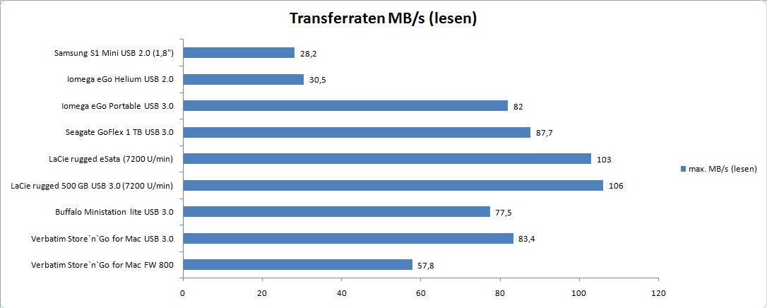 Bis auf wenige Ausnahmen ist USB 3.0 am Mac derzeit nicht nutzbar. Die Verbatim for Mac arbeitet somit nur nach dem USB 2.0 Standard. Die erzielten Ergebnisse sind für den High-Speed Modus aber sehr ansehnlich und erreichen sehr gute 37 MB/s beim sequentiellen Lesen und 34 MB/s beim sequentiellen Schreiben.